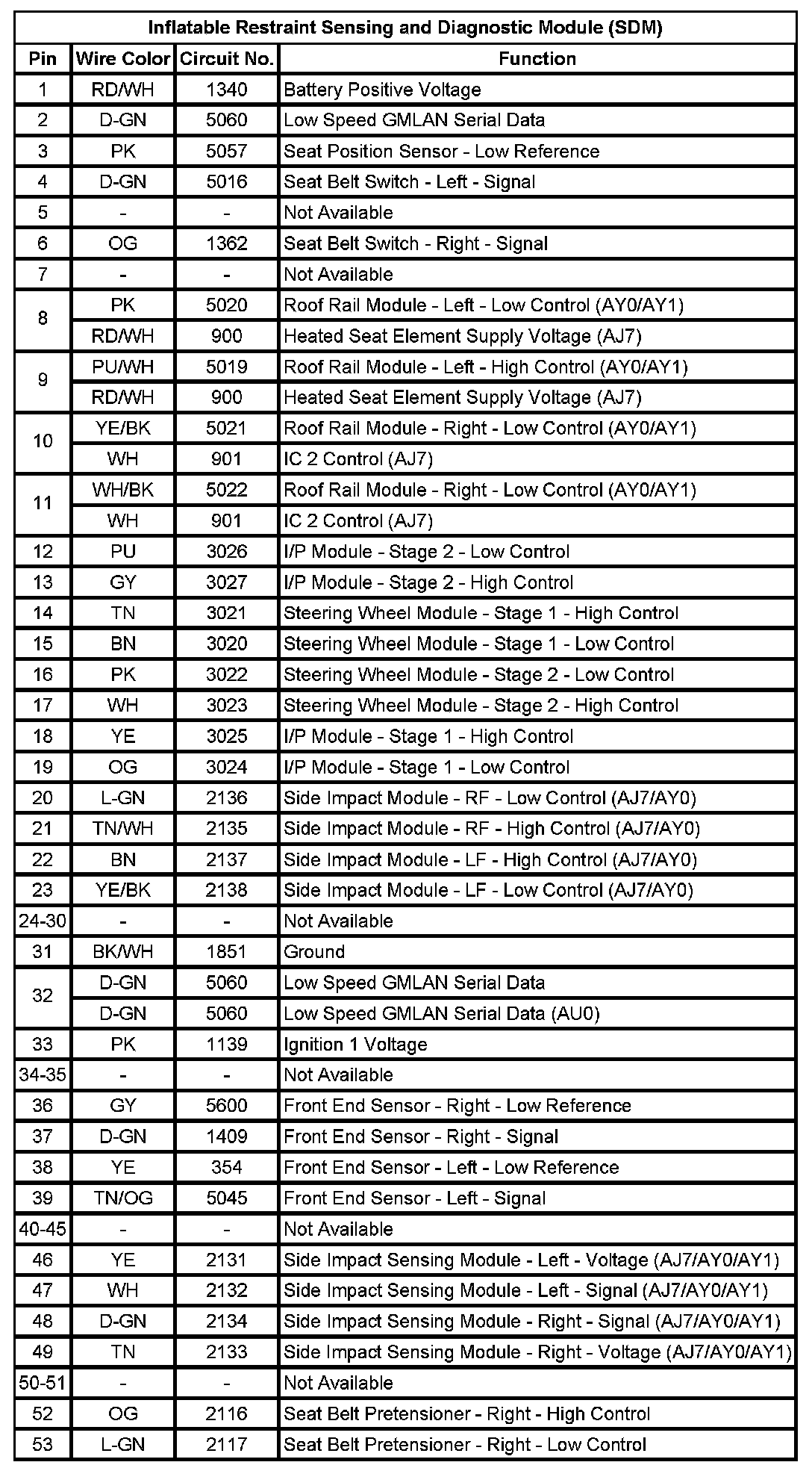 Inflatable Restraint Sensing And Diagnostic Module (SDM) (Pin 1 To 53):
