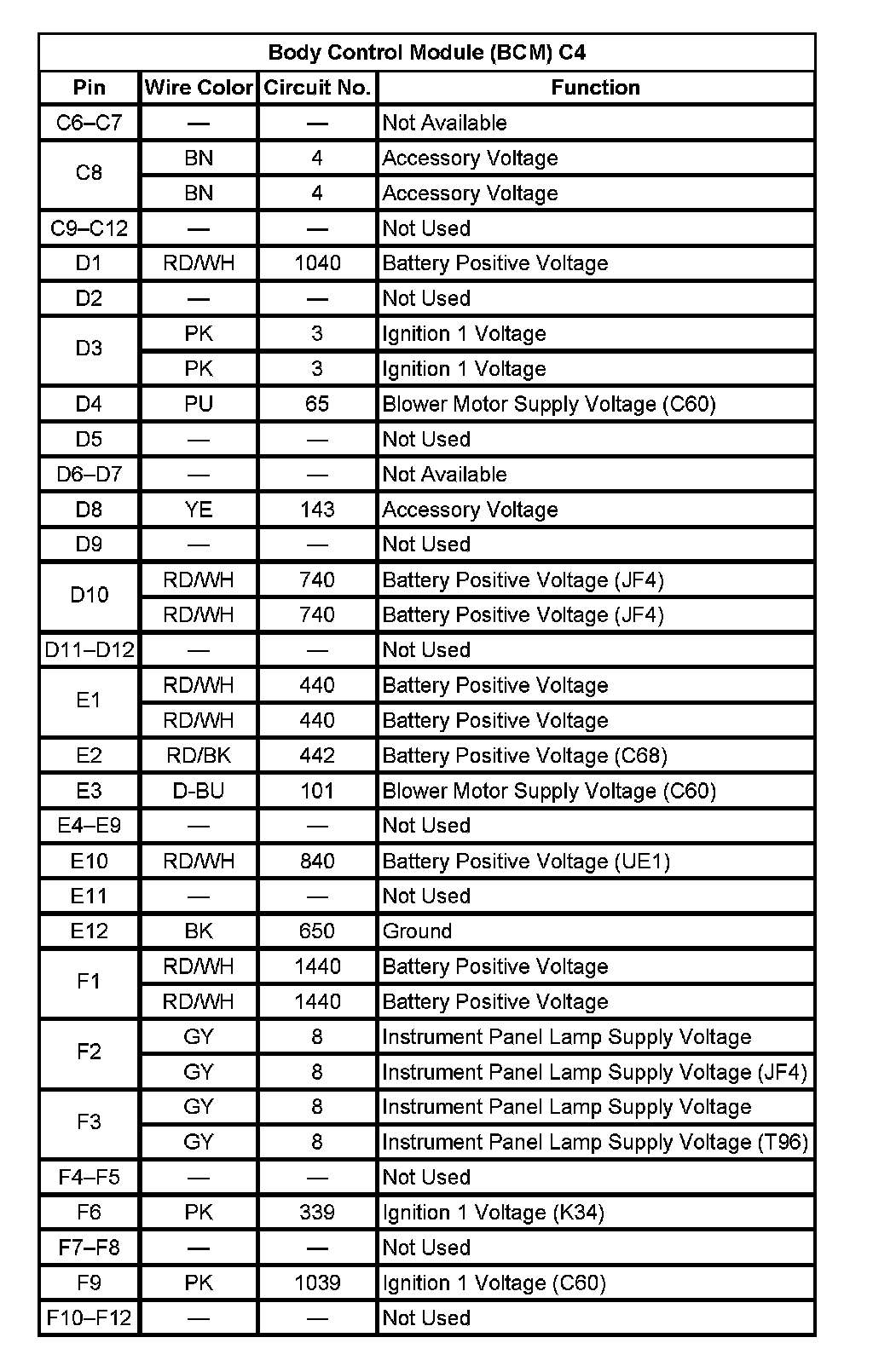 Body Control Module (BCM) C4 (Pin C6 To F12):
