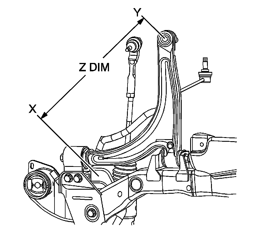 The Z height dimension measurement determines the proper ride height for the front end of the vehicle. There is no adjustment procedure. Repair may require replacement of suspension components.