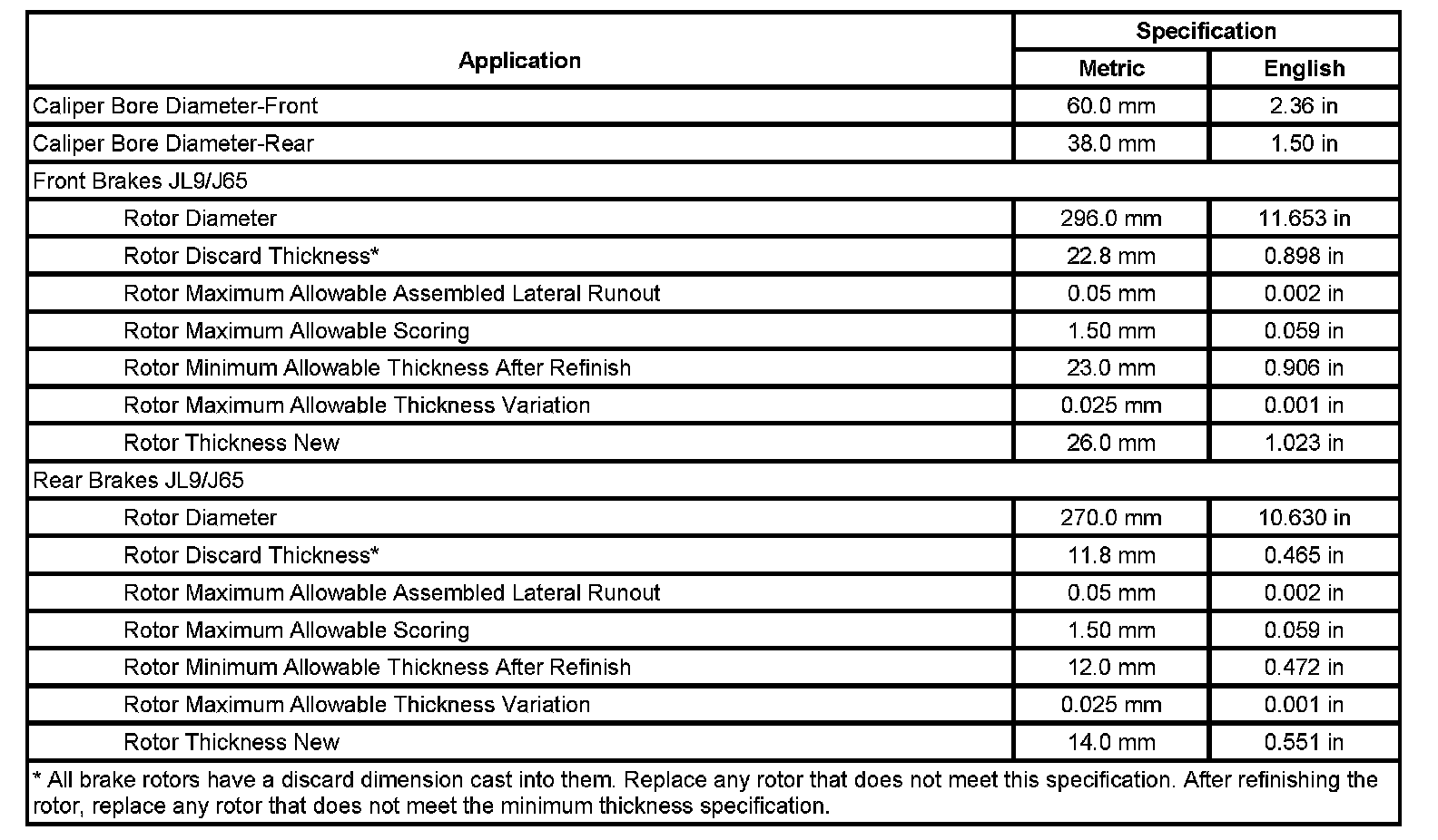Disc Brake Component Specifications:
