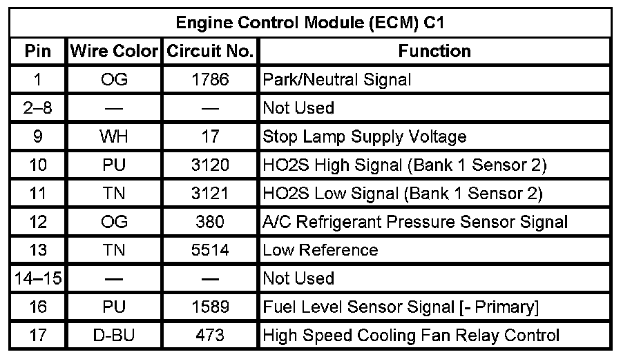 Engine Control Module (ECM) C1 (Pin 1 To 17):