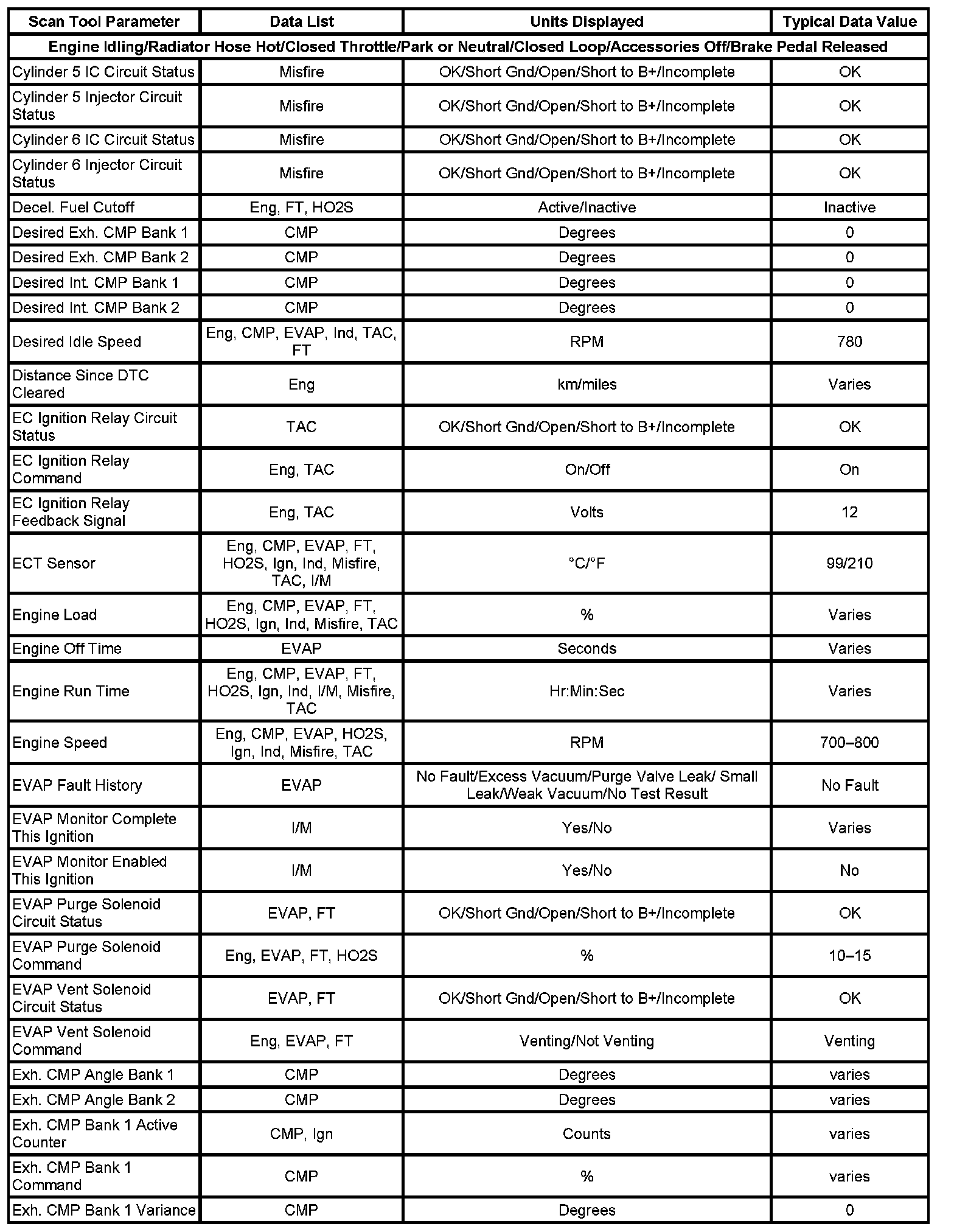 The Engine Scan Tool Data List contains all engine controls-related parameters that are available on the scan tool. The list is arranged in alphabetical order. A given parameter may appear in any one of the data lists, and in some cases may appear more than once, or in more than one data list in order to group certain related parameters together.
