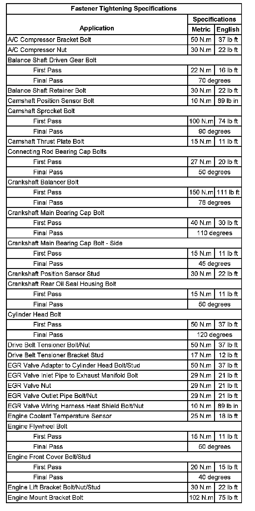 Fastener Tightening Specifications: