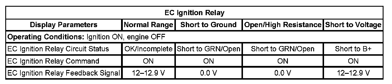 9. Ignition ON, engine OFF, monitor the EC Ignition Relay Feedback parameter with a scan tool. The parameter should display B+.