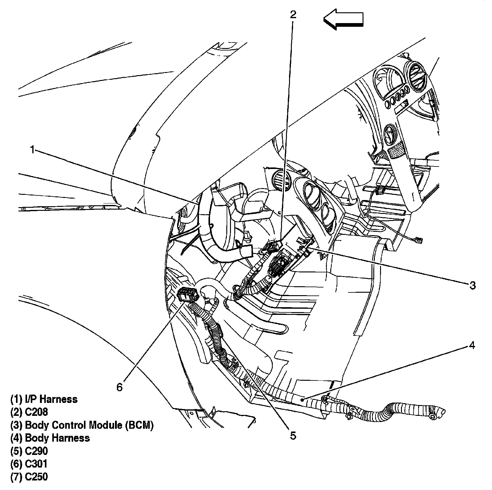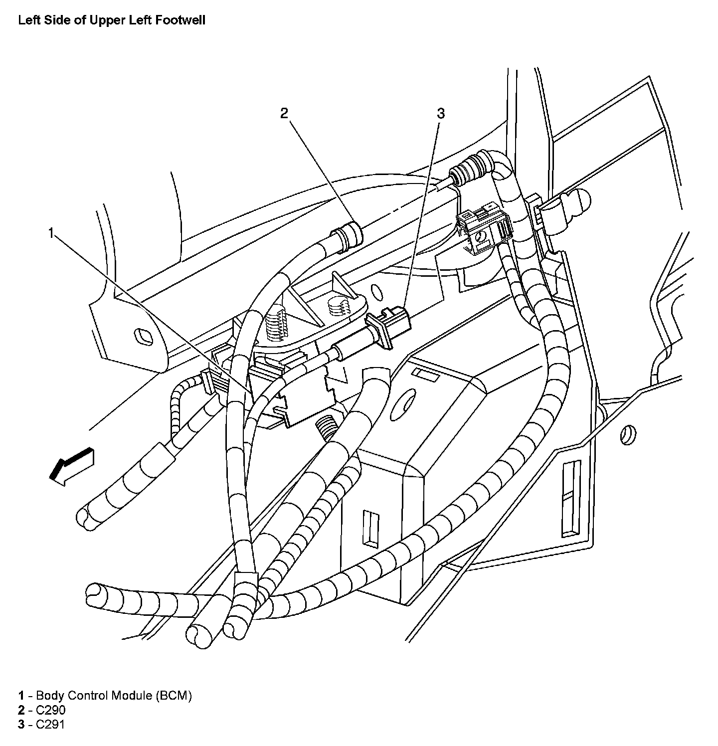 The Body Control Module (BCM) is located below the left side of the instrument panel (I/P), left of the steering column.