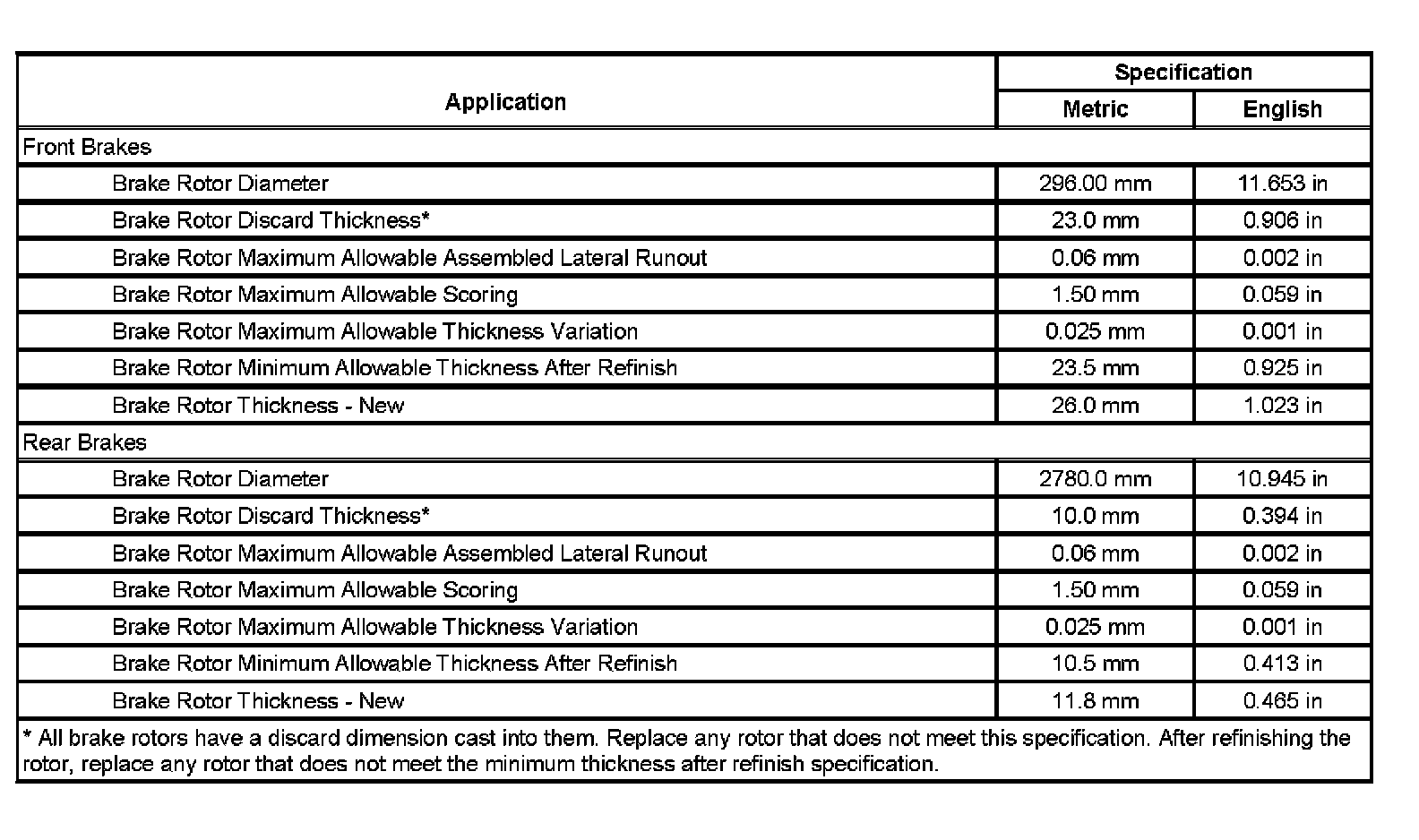 Disc Brake Component Specifications: