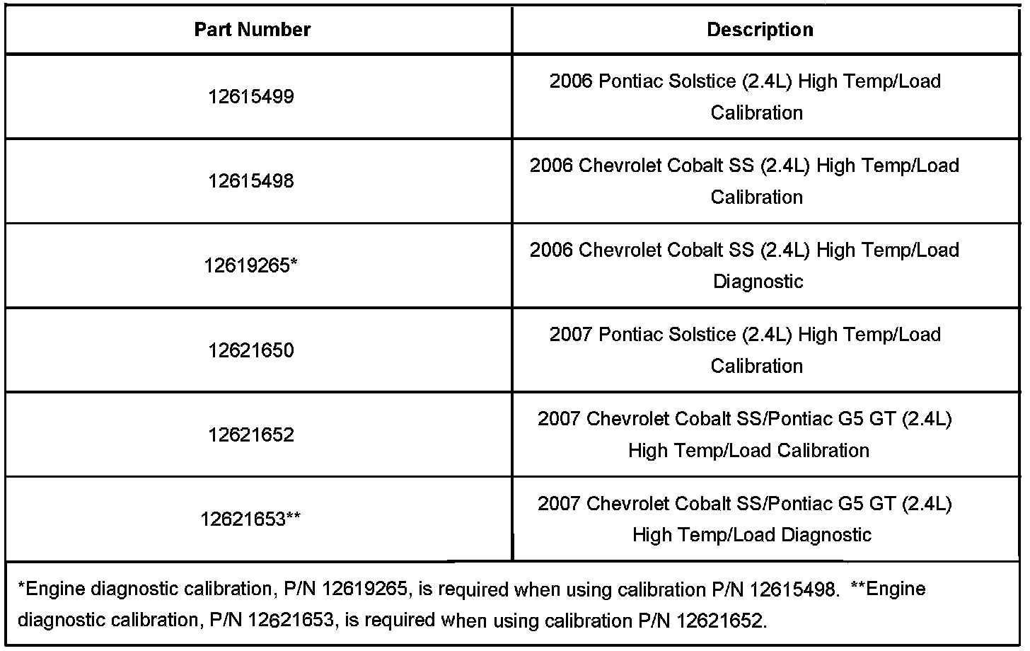 These calibrations are to be used in Pontiac Solstice, G5 GT and Chevrolet Cobalt SS specific model vehicles only. These calibrations do not apply to all LE5 engines.