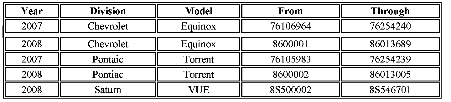 Involved are certain 2007-2008 Chevrolet Equinox and Pontiac Torrent vehicles equipped with a 3.4L engine (RPO LNJ); and 2008 Saturn VUE vehicles equipped with a 2.4L engine (RPO LE5) and built within the VIN breakpoints shown.