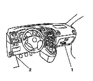 The powertrain control module (PCM) is a precision 32-bit microprocessor and is an essential part of the electronic control system. The PCM is responsible for such major functions as control of the fuel injectors, the idle air control (IAC) valve, the fuel pump relay, etc. The PCM (1) is located below the instrument panel (IP) storage compartment. Communication with the PCM is through the data link connector (2) located on the left side below the IP.