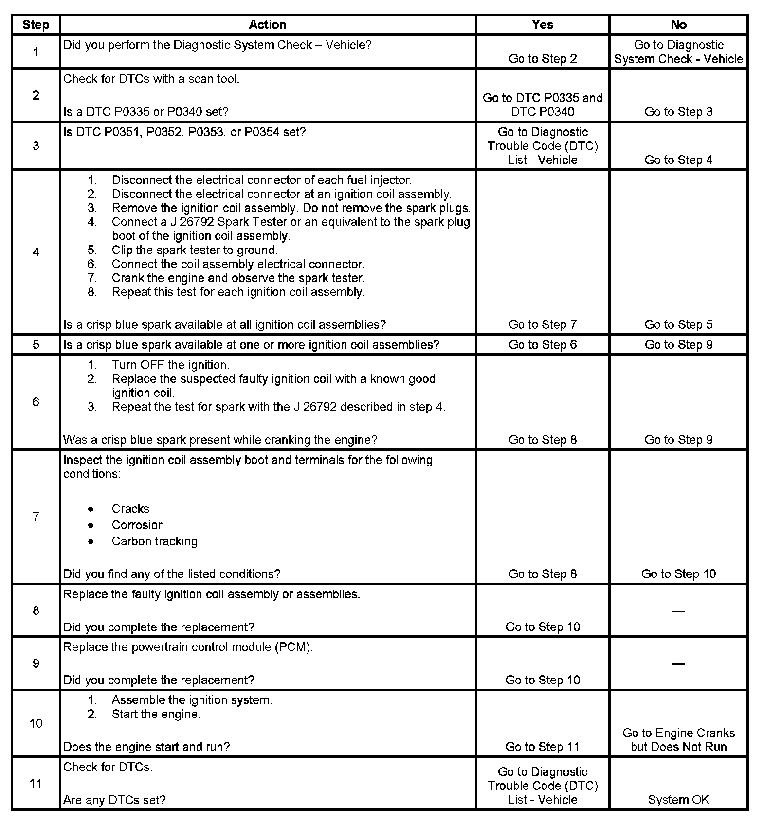3. If there is a fault in the electrical circuits between the PCM and the ignition coil assemblies, a DTC P0351-P0354 will set. Use the DTC P0351-P0354 diagnostic table in order to repair the ignition system failure.