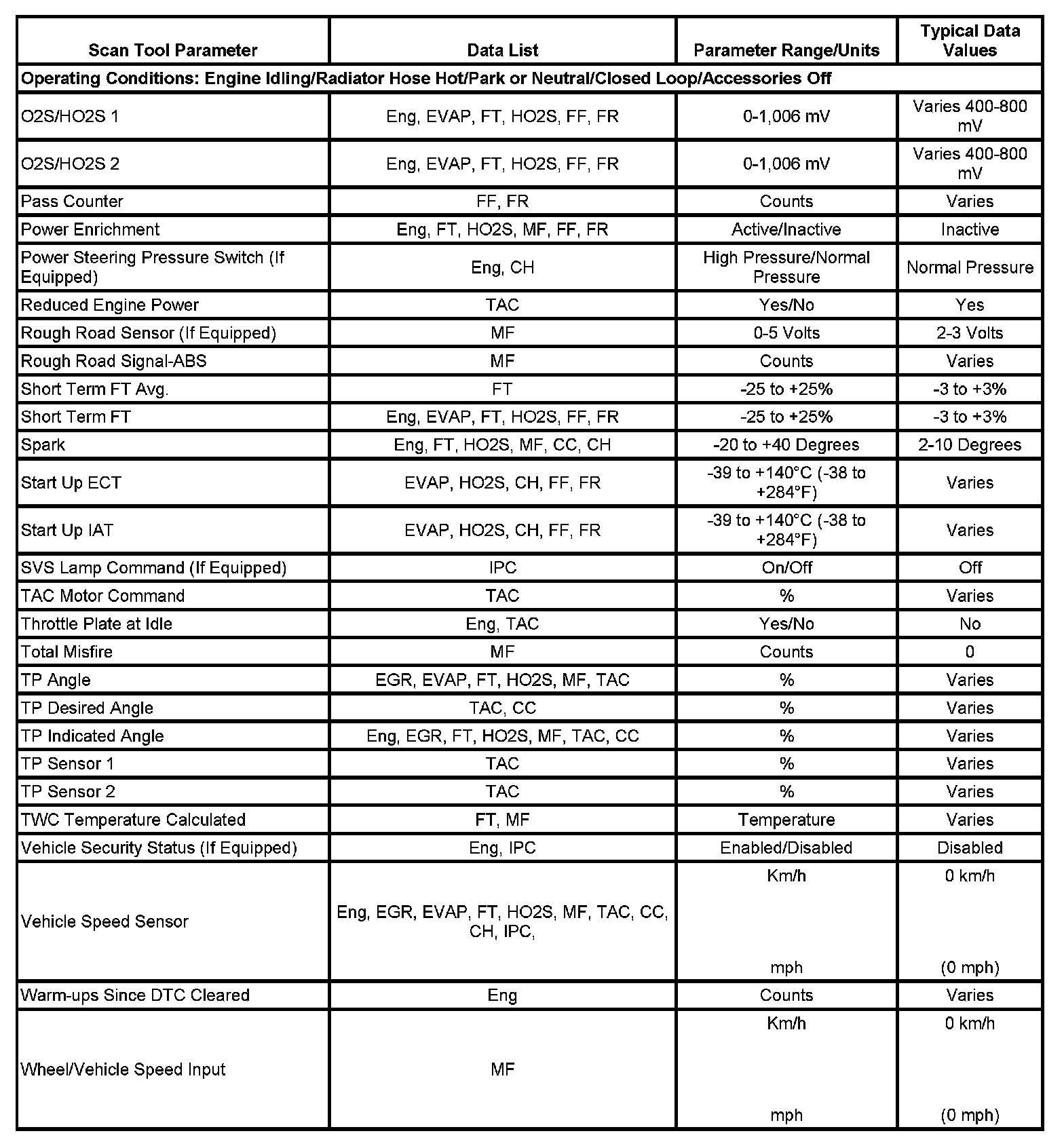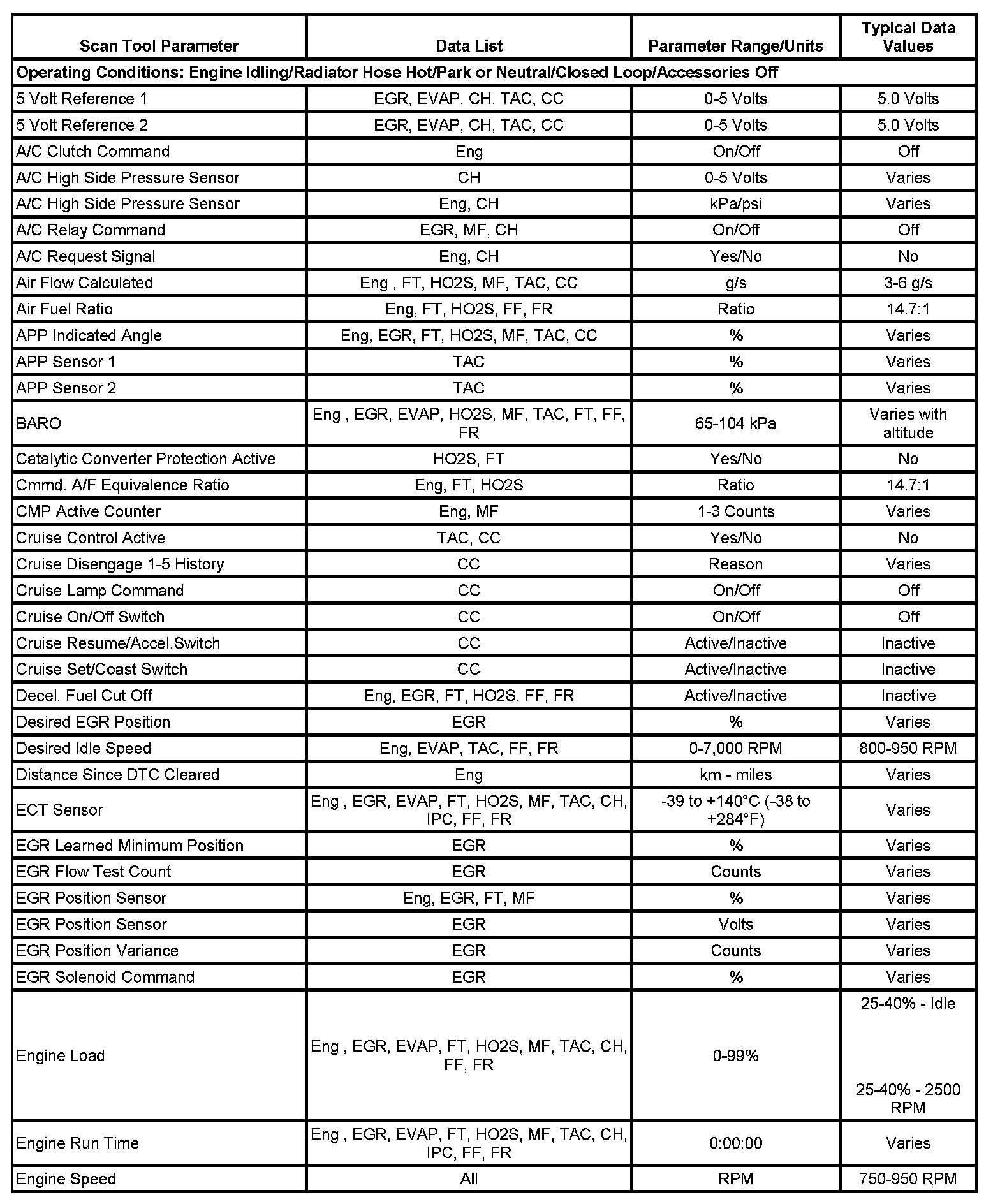 Scan tool values from an engine that is operating correctly may be used for comparison with the engine you are diagnosing. The Engine Scan Tool Data List represents the values that would be seen on a normal operating engine.