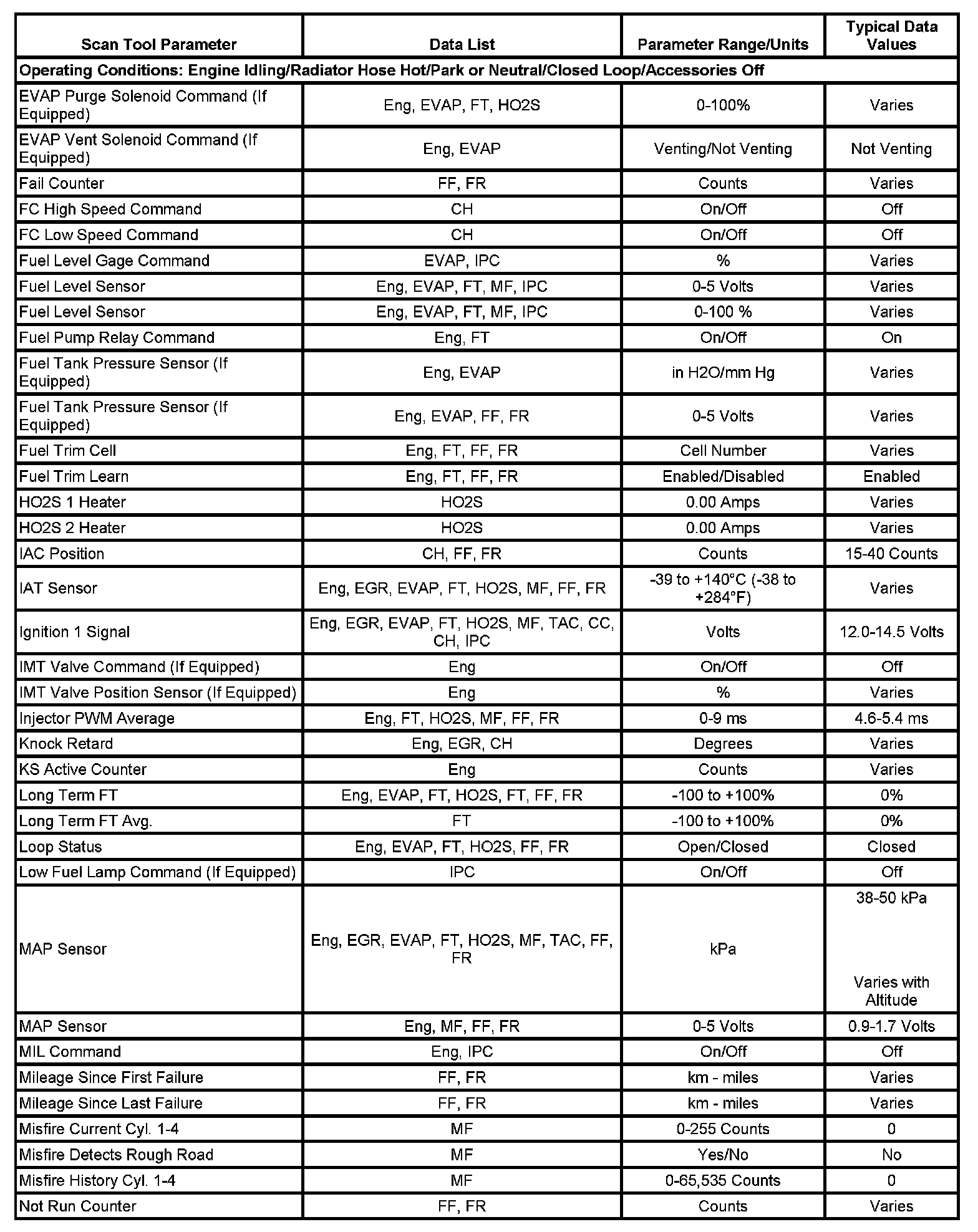 The Engine Scan Tool Data List contains all engine related parameters that are available on the scan tool. The list is arranged in alphabetical order. A parameter may appear in any one of the data lists, and in some cases may appear more than once, or in more than one data list in order to group certain related parameters together.