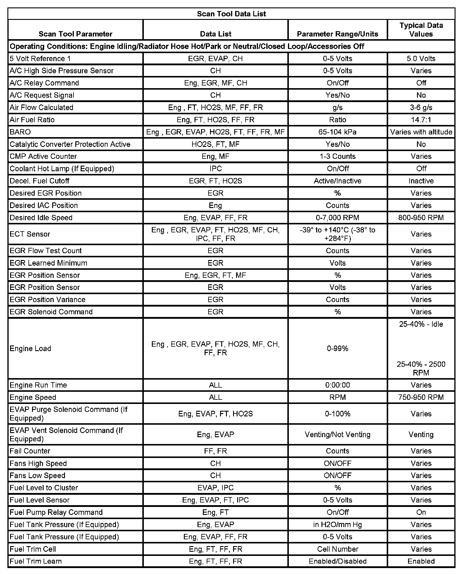 The Engine Scan Tool Data List contains all engine related parameters that are available on the scan tool. The list is arranged in alphabetical order. A parameter may appear in any one of the data lists, and in some cases may appear more than once, or in more than one data list in order to group certain related parameters together.