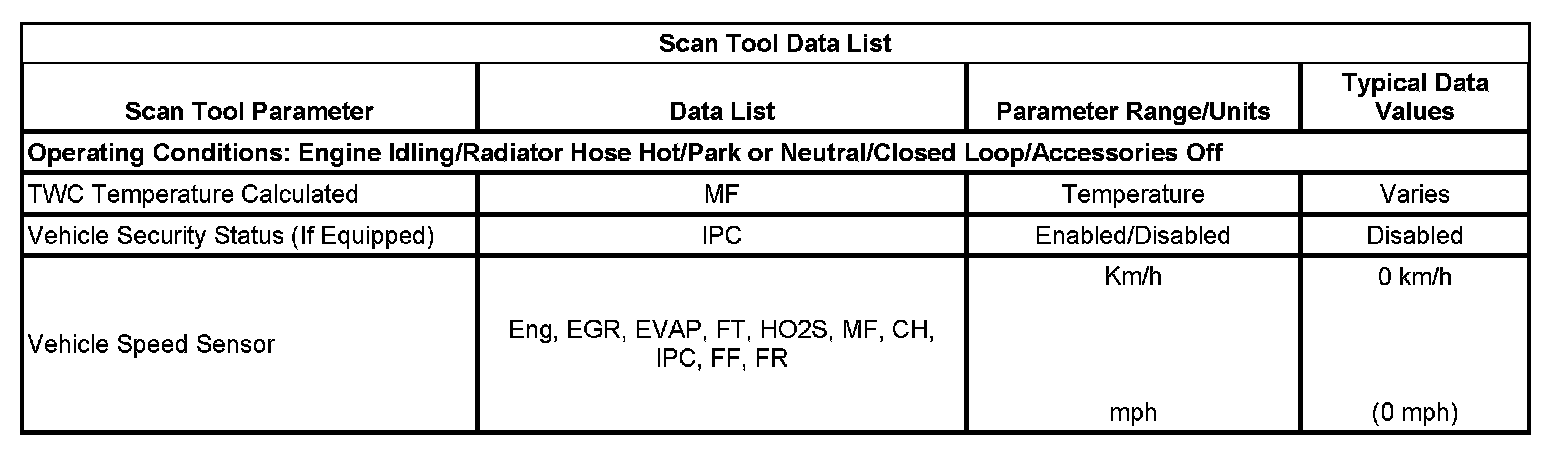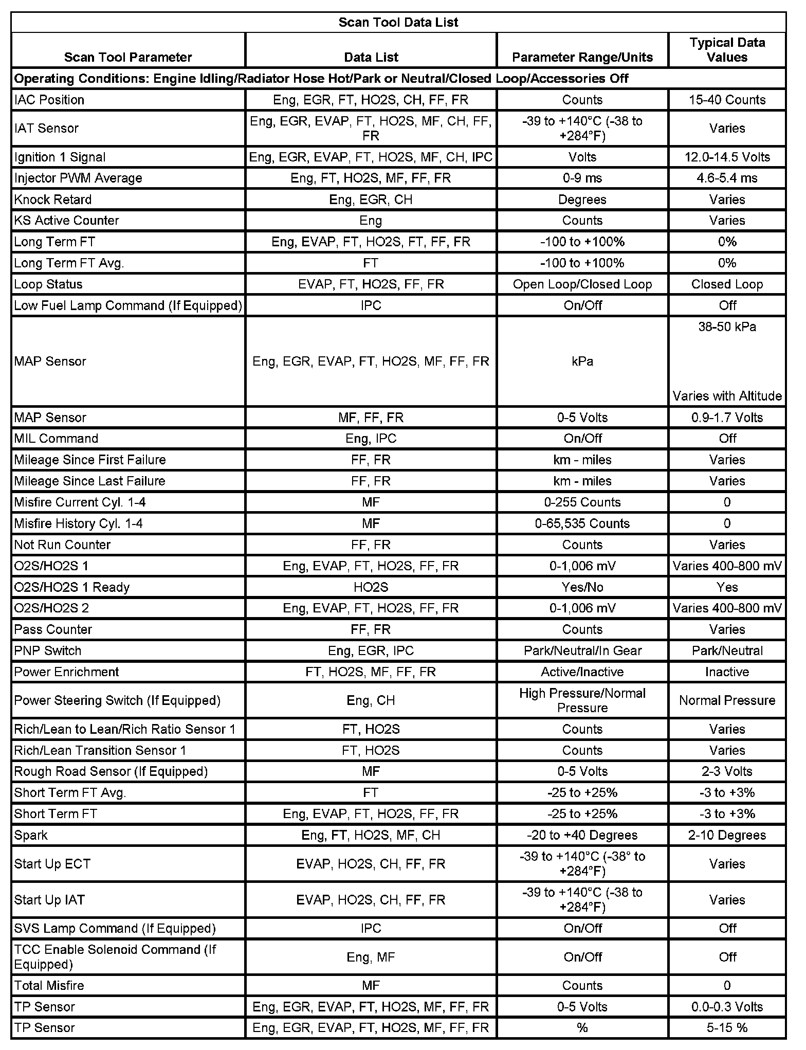 Scan tool values from an engine that is operating correctly may be used for comparison with the engine you are diagnosing. The Engine Scan Tool Data List represents the values that would be seen on a normal operating engine.