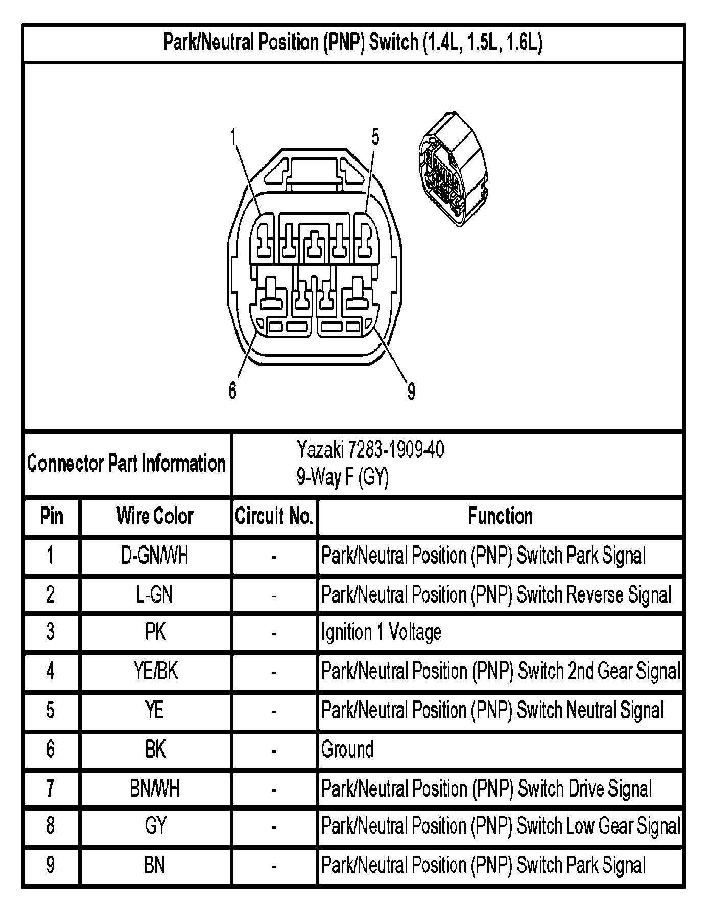 Park/Neutral Position (PNP) Switch (1.4L, 1.5L, 1.6L):