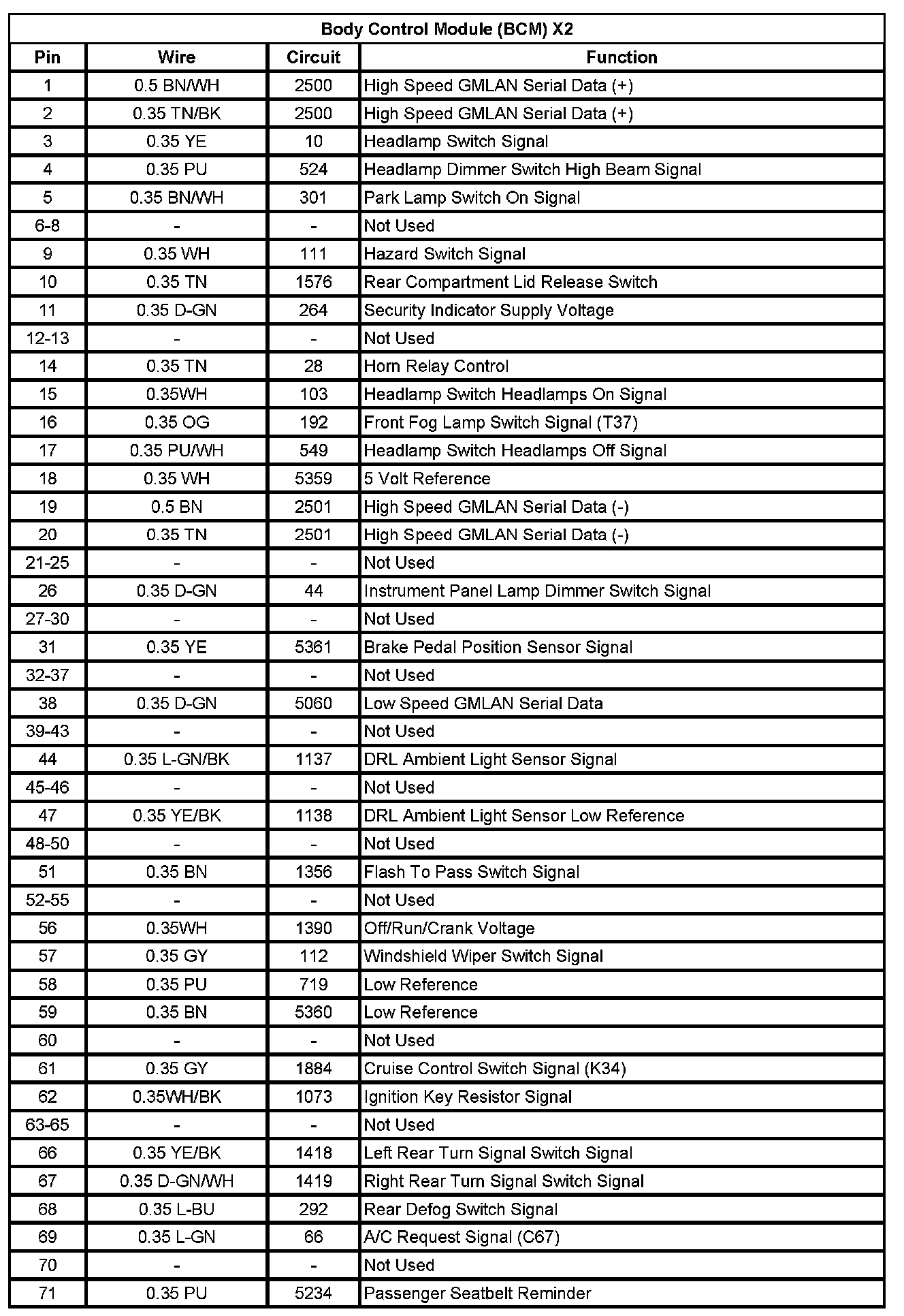 Body Control Module (BCM) X2 (Pin 1 To 71):