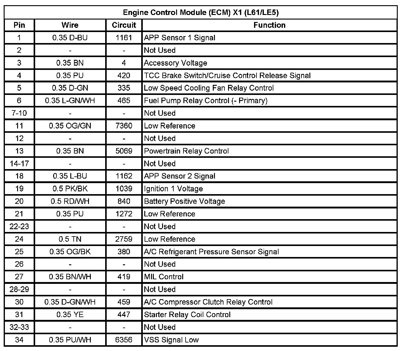 Engine Control Module (ECM) X1 (L61/LE5) (Pin 1 To 34):