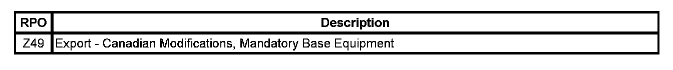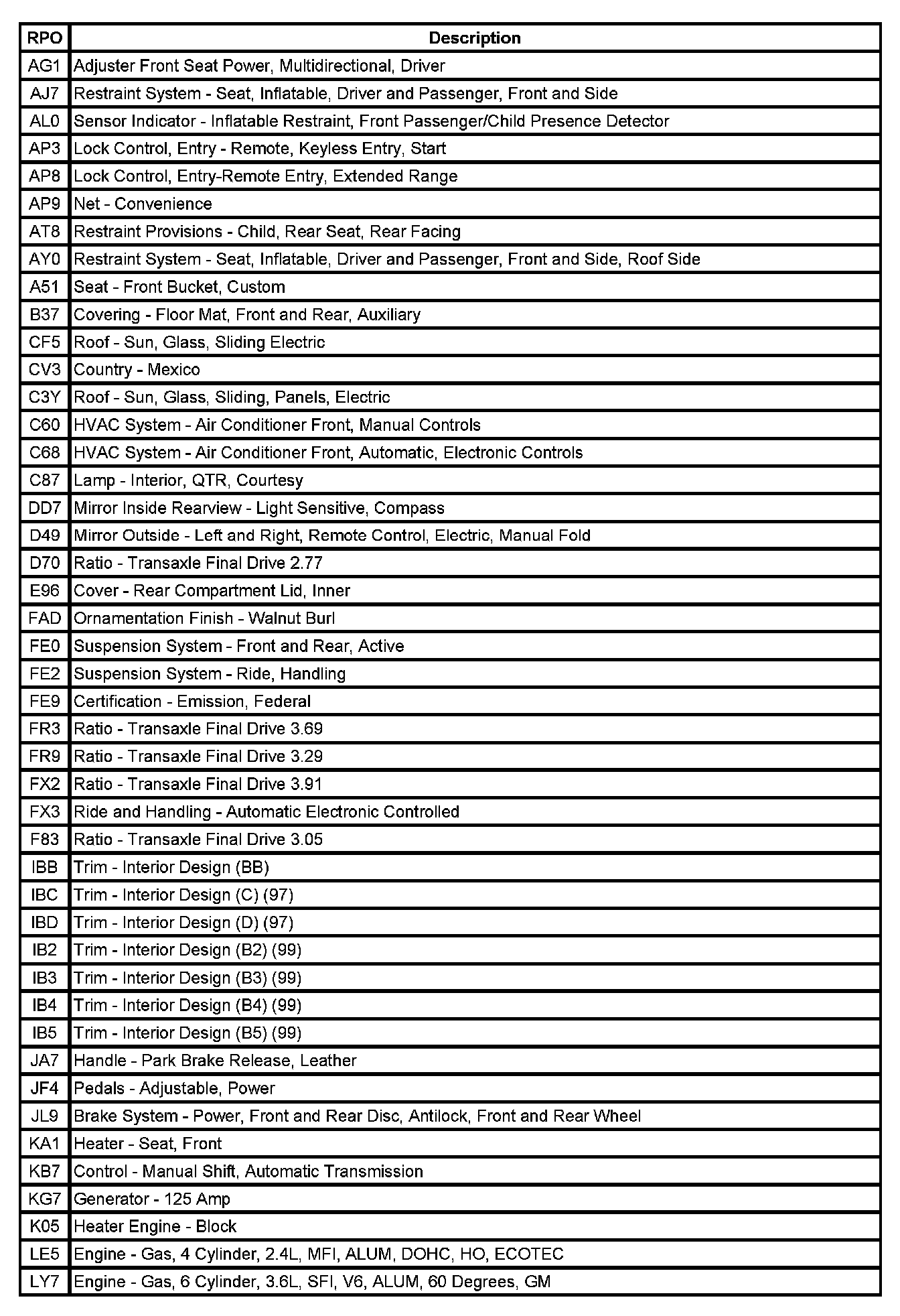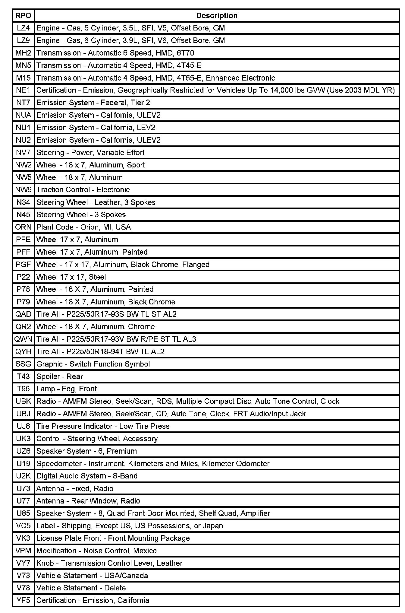 RPO Code List
