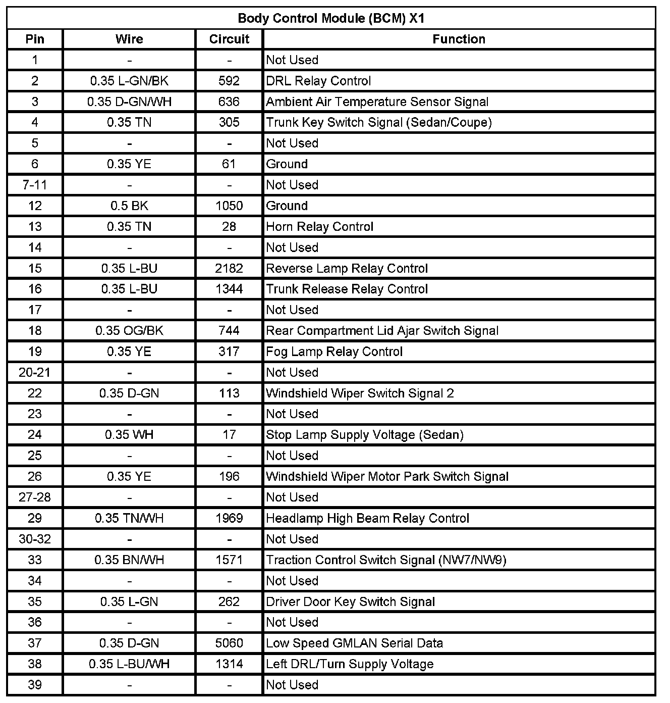 Body Control Module (BCM) X1 (Pin 1 To 39):