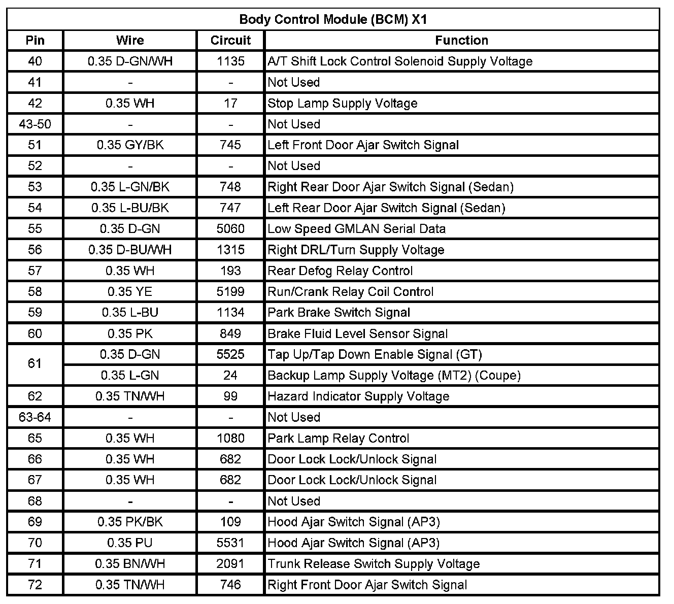 Body Control Module (BCM) X1 (Pin 40 To 72):