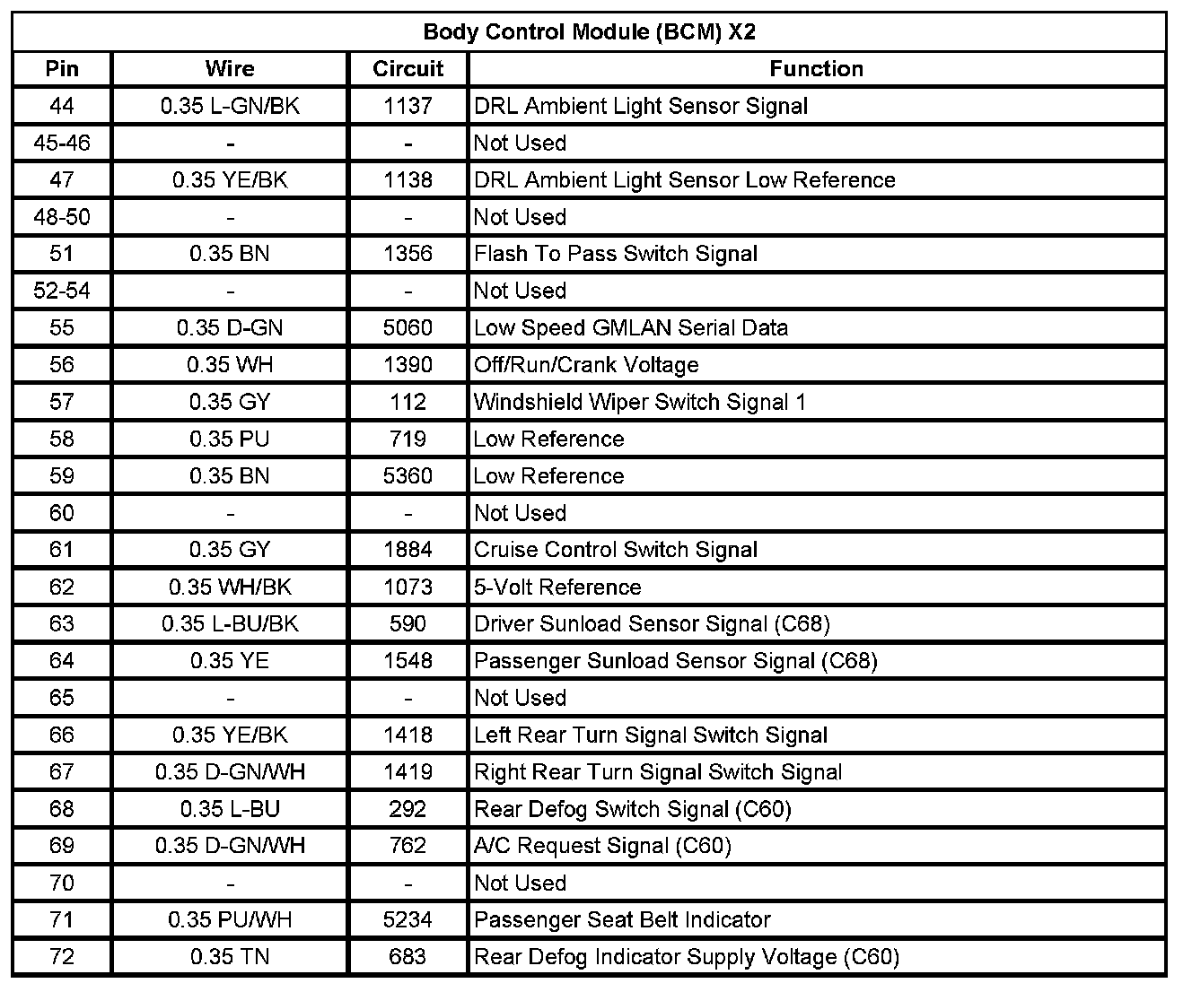 Body Control Module (BCM) X2 (Pin 44 To 72):