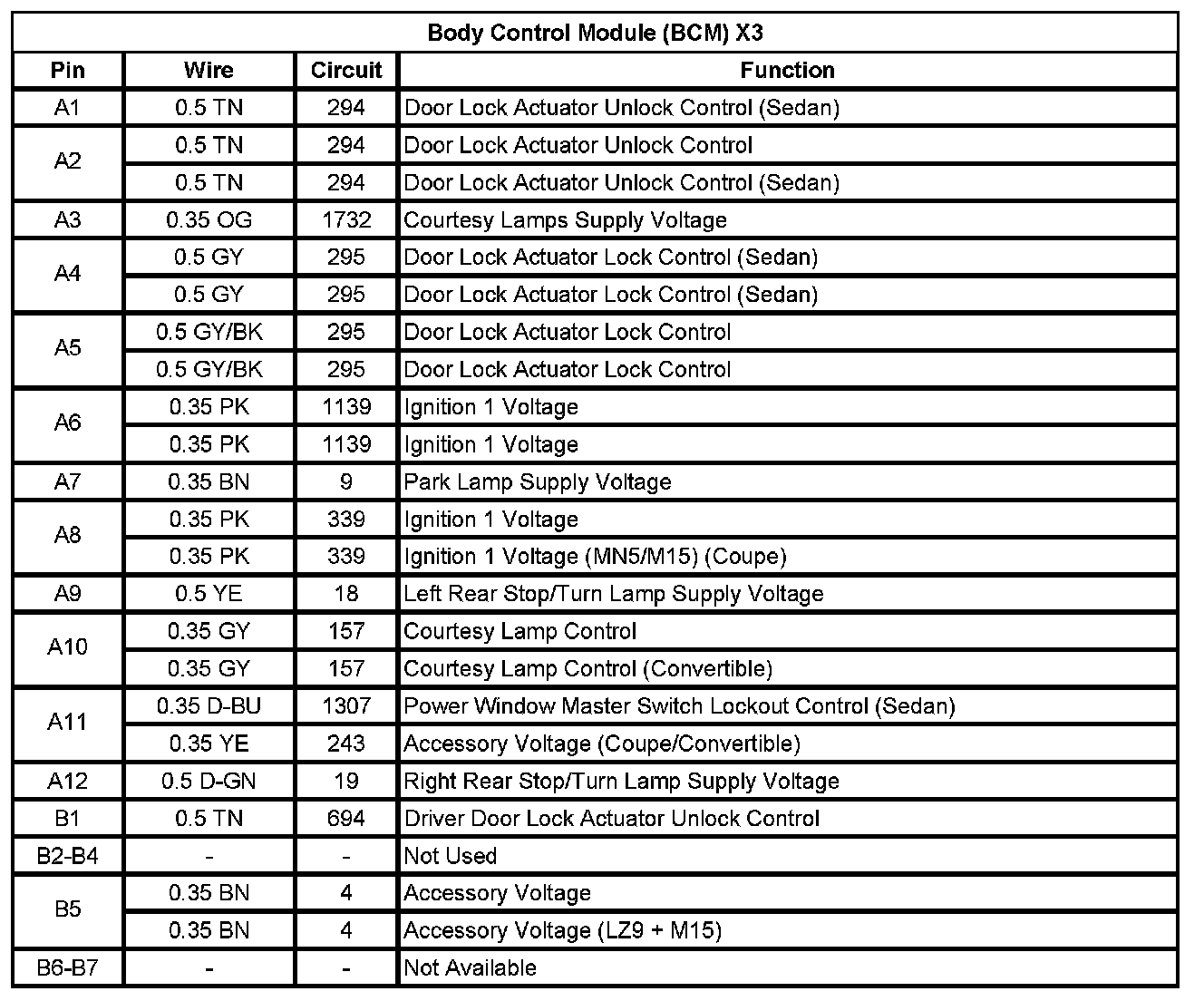 Body Control Module (BCM) X3 (Pin A1 To B7):