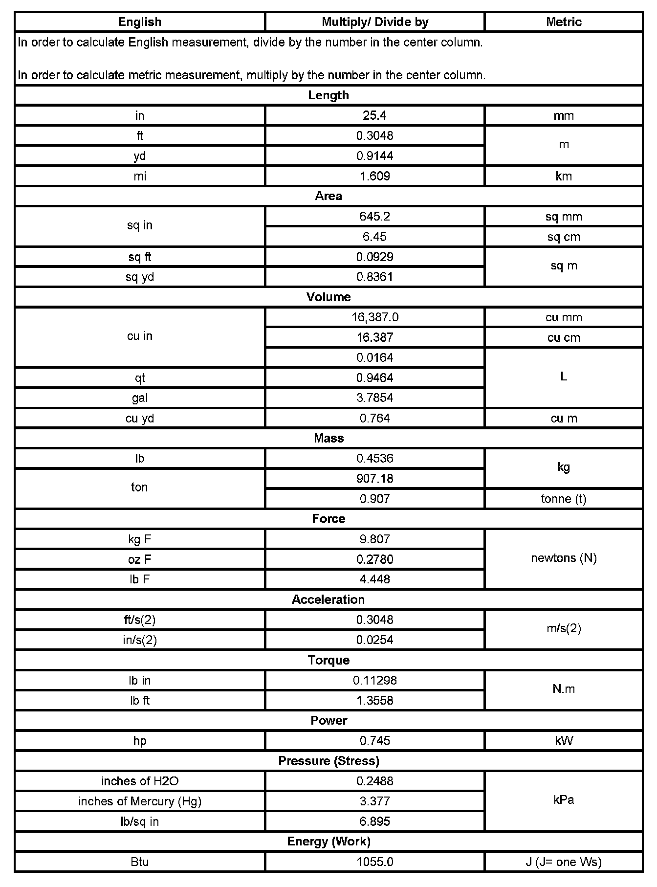 US English/Metric Conversion