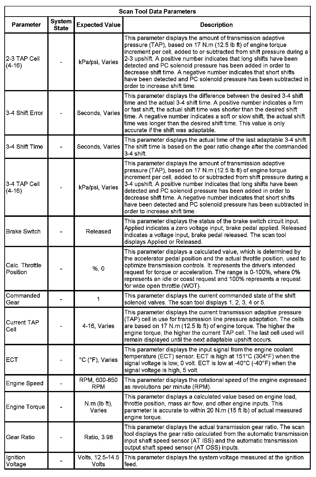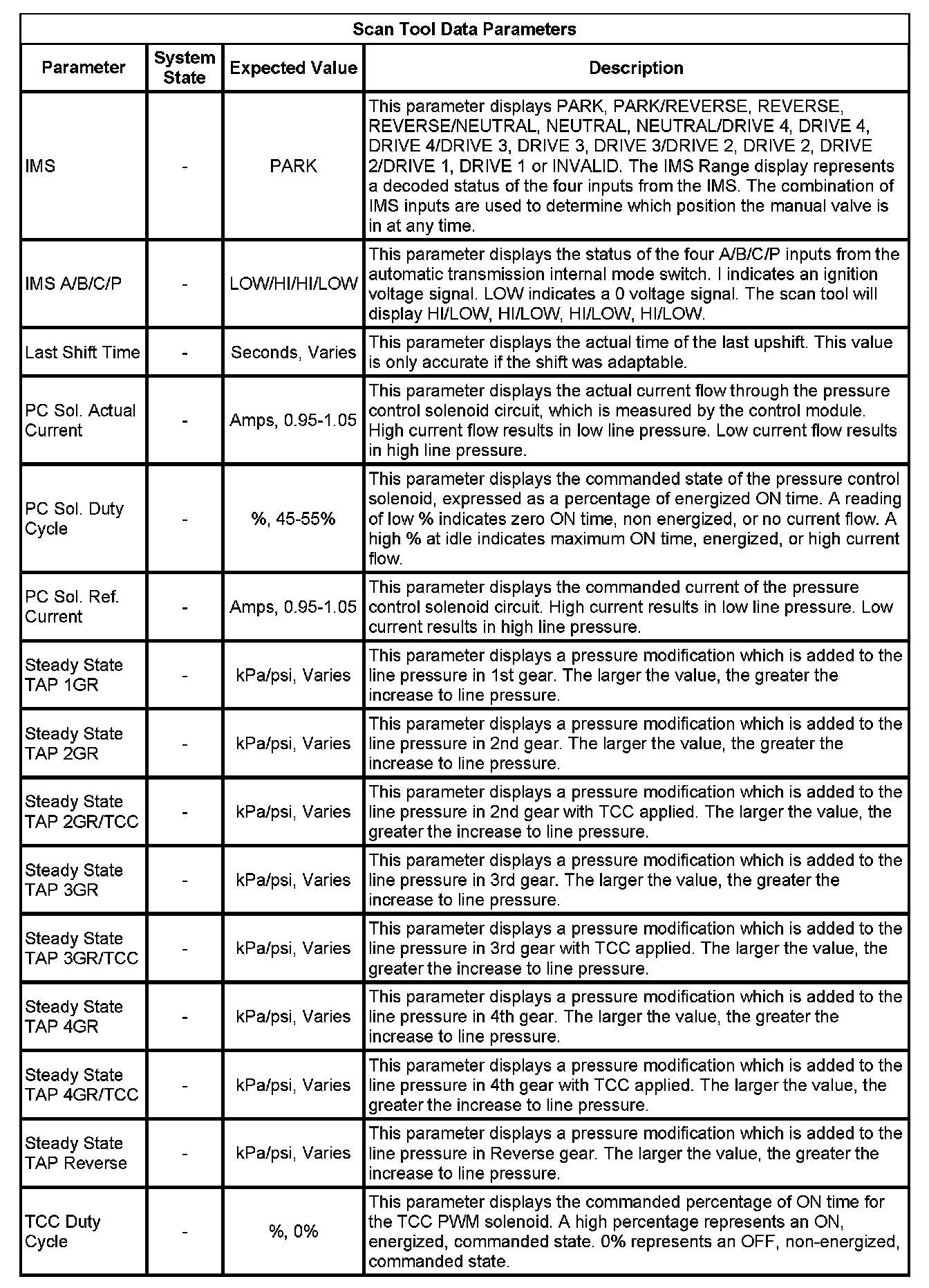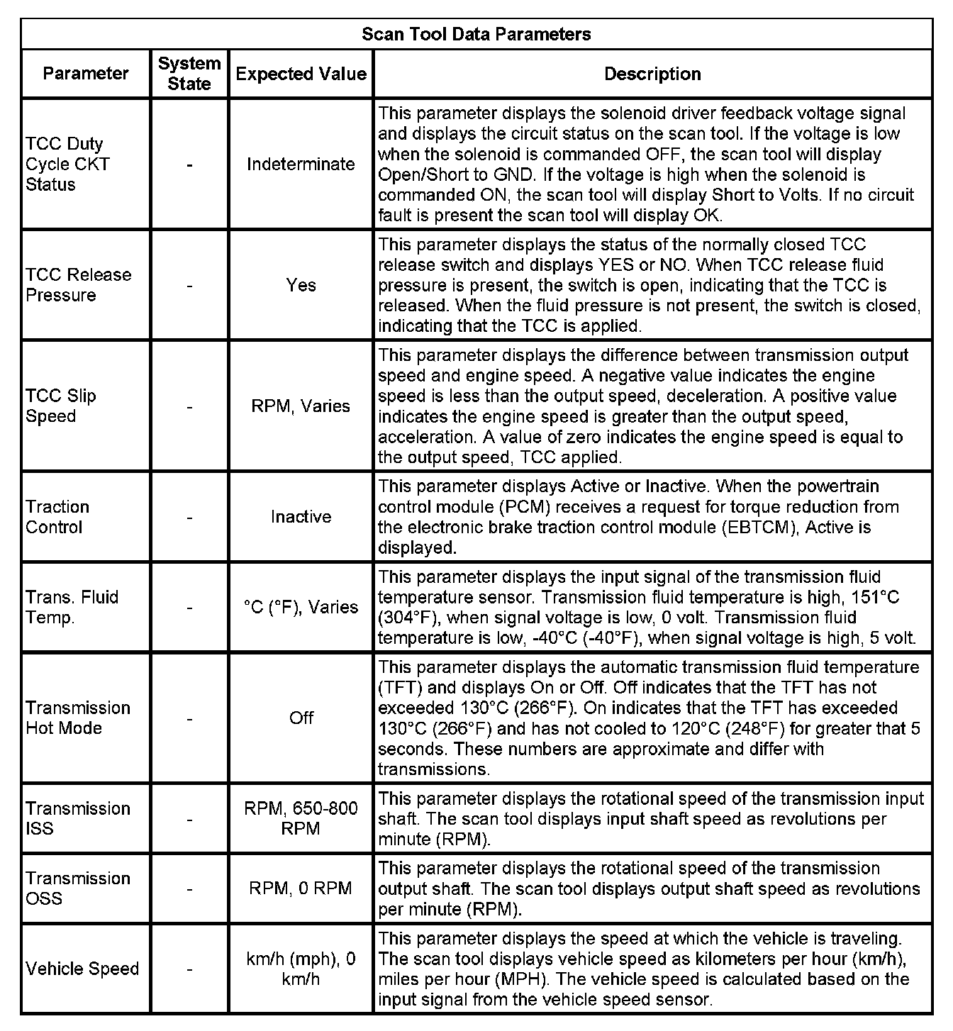 The Transmission Control Module Scan Tool Data List contains all transmission related parameters that are available on the scan tool. The list is arranged in alphabetical order. A given parameter may appear in any one of the data lists, and in some cases may appear more than once, or in more than one data list in order to group certain related parameters together.