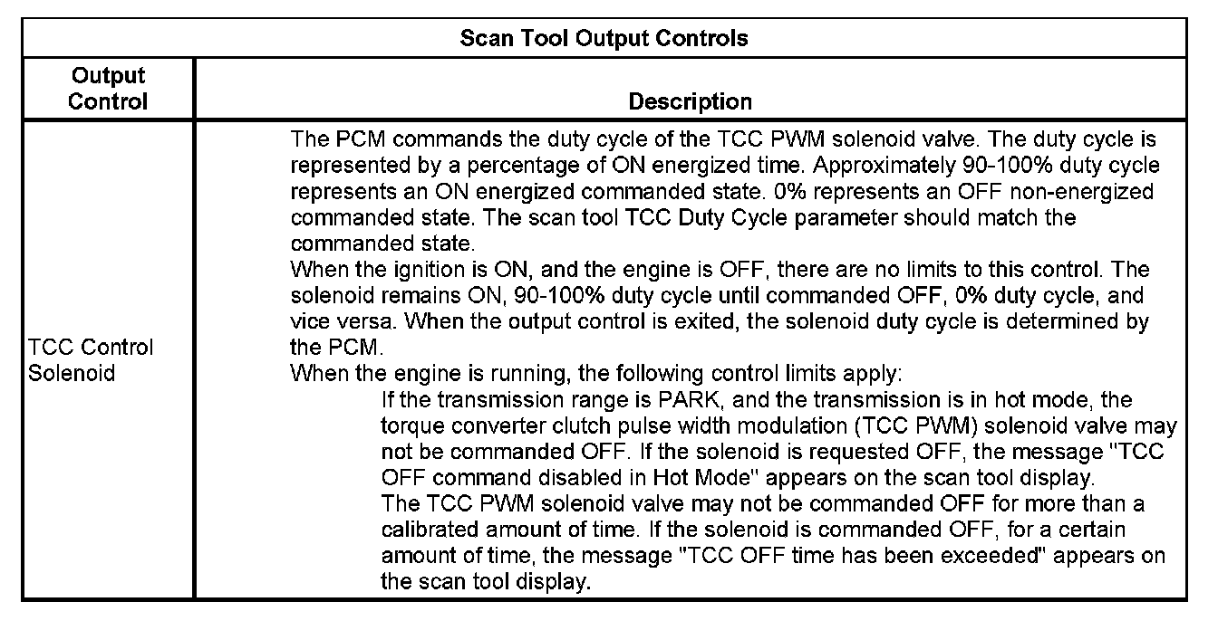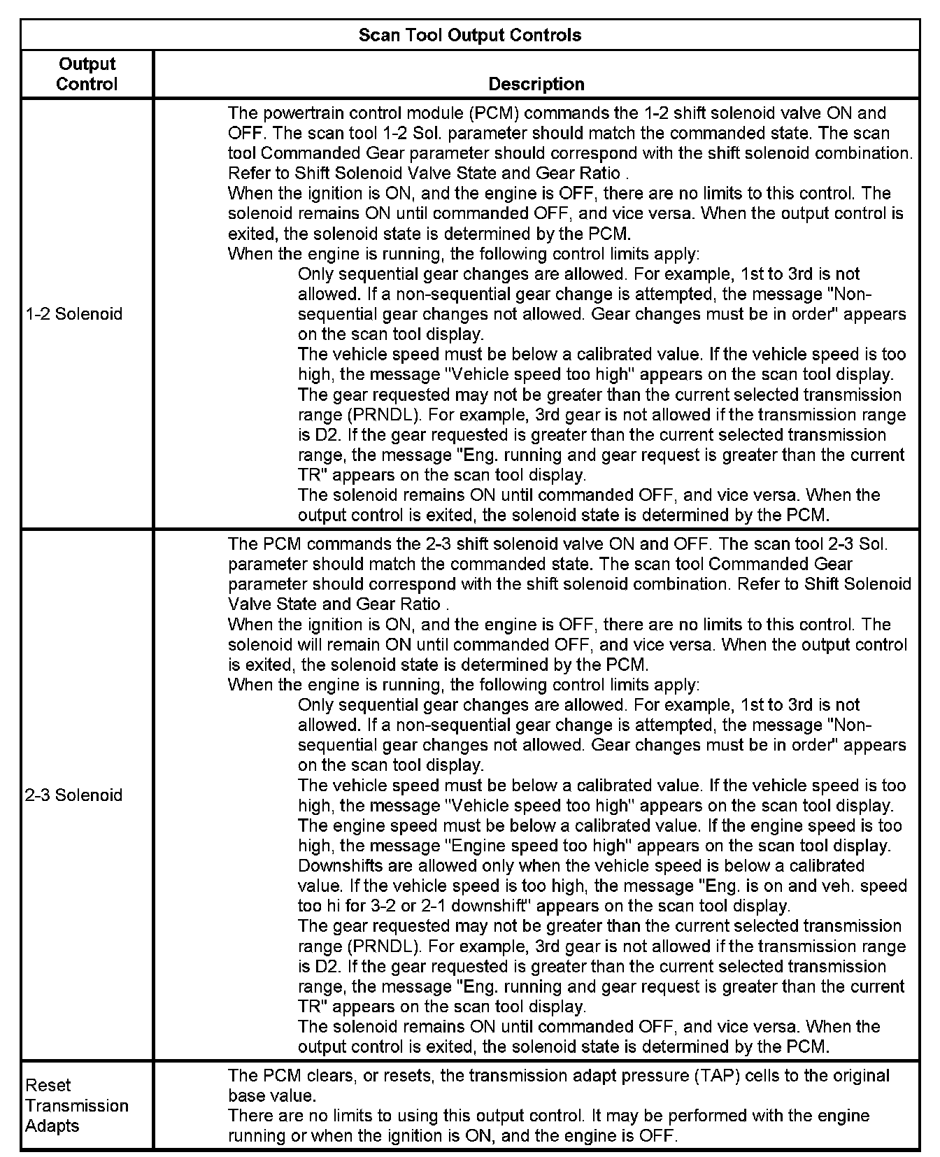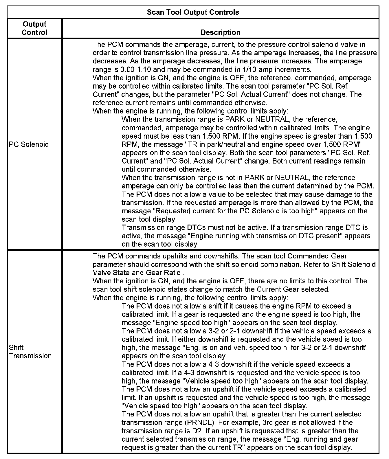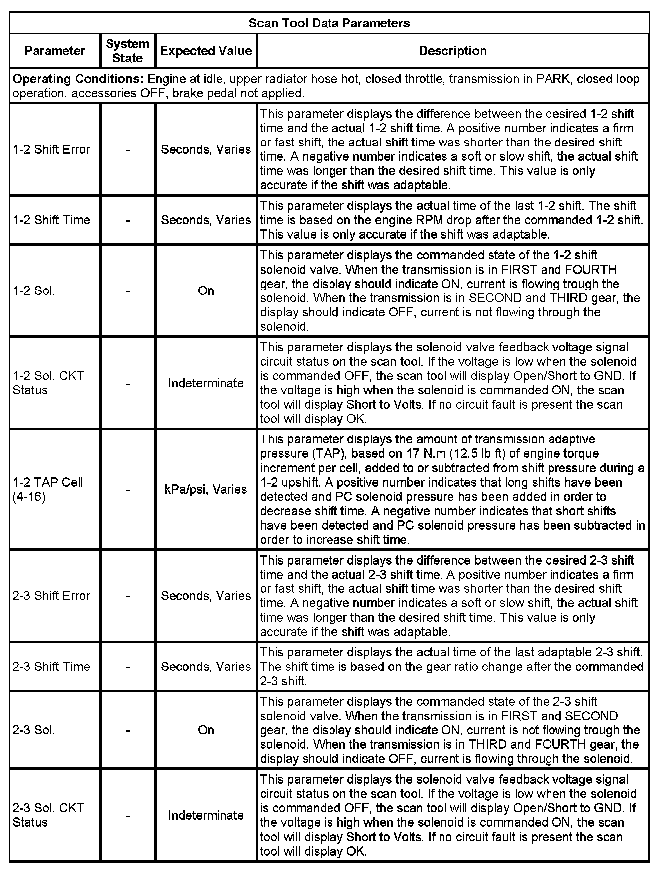 The Transmission Control Module Scan Tool Data List contains all transmission related parameters that are available on the scan tool. The list is arranged in alphabetical order. A given parameter may appear in any one of the data lists, and in some cases may appear more than once, or in more than one data list in order to group certain related parameters together.