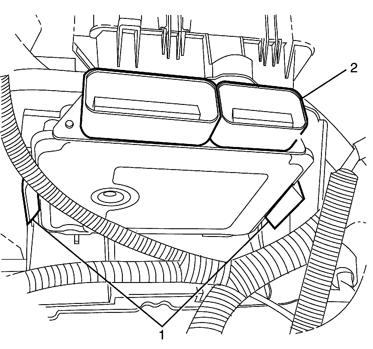 1. Install the ECM (2) to the ECM housing, make sure the ECM retaining clips (1) are located correctly.