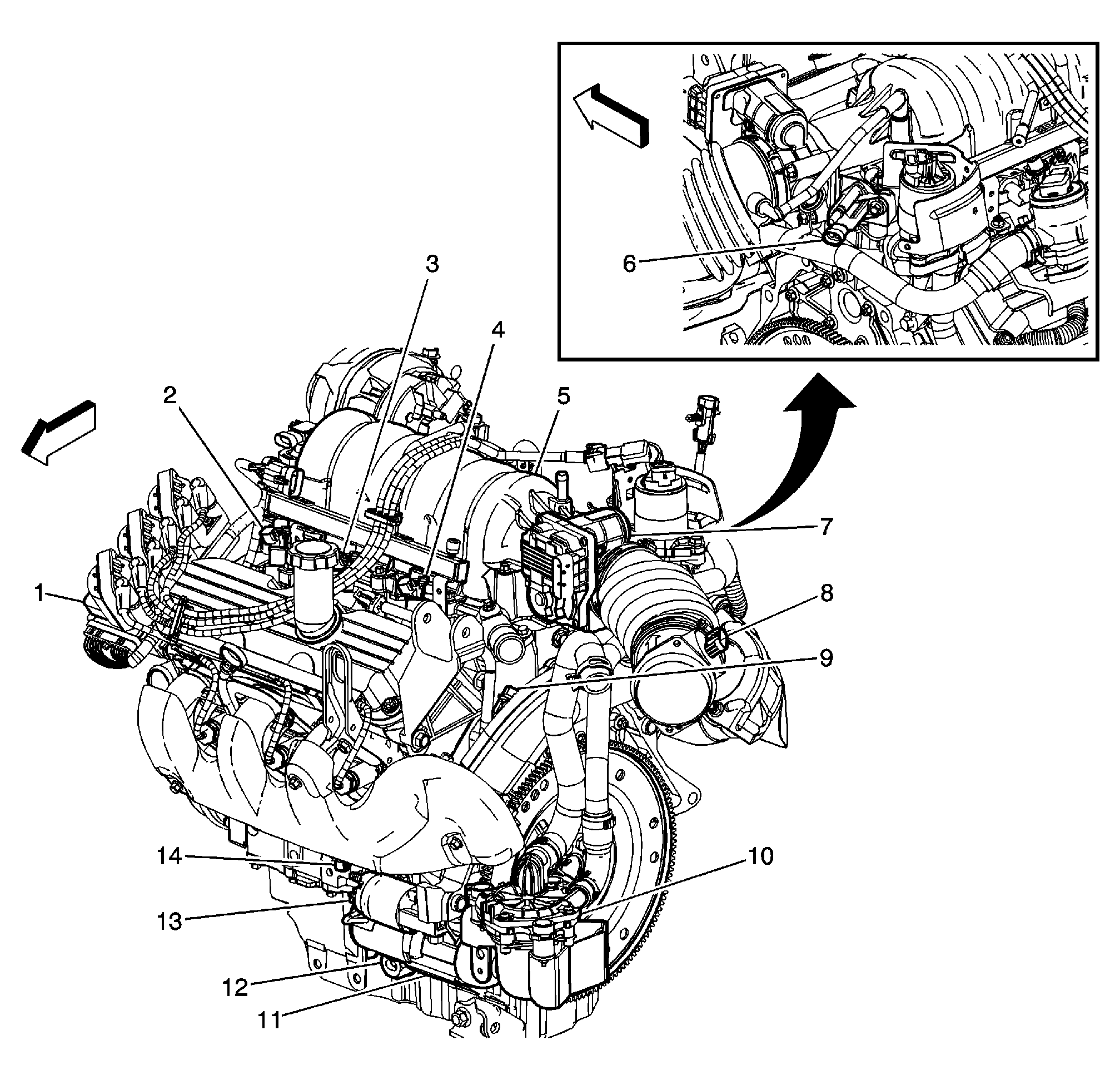 | Ignition Control Module (ICM) (1) | Top left front of engine. See Figure. |
