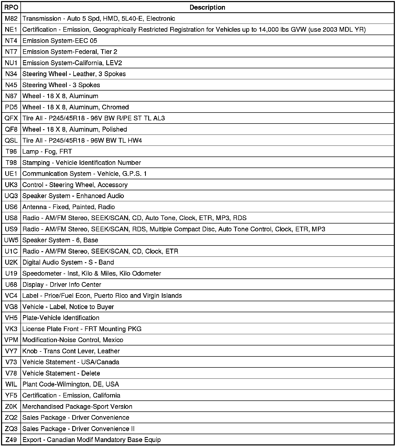 The following table provides the description of the Regular Production Option (RPO) codes that are available on the vehicle. The vehicle RPO list is printed on the Service Parts Identification Label.