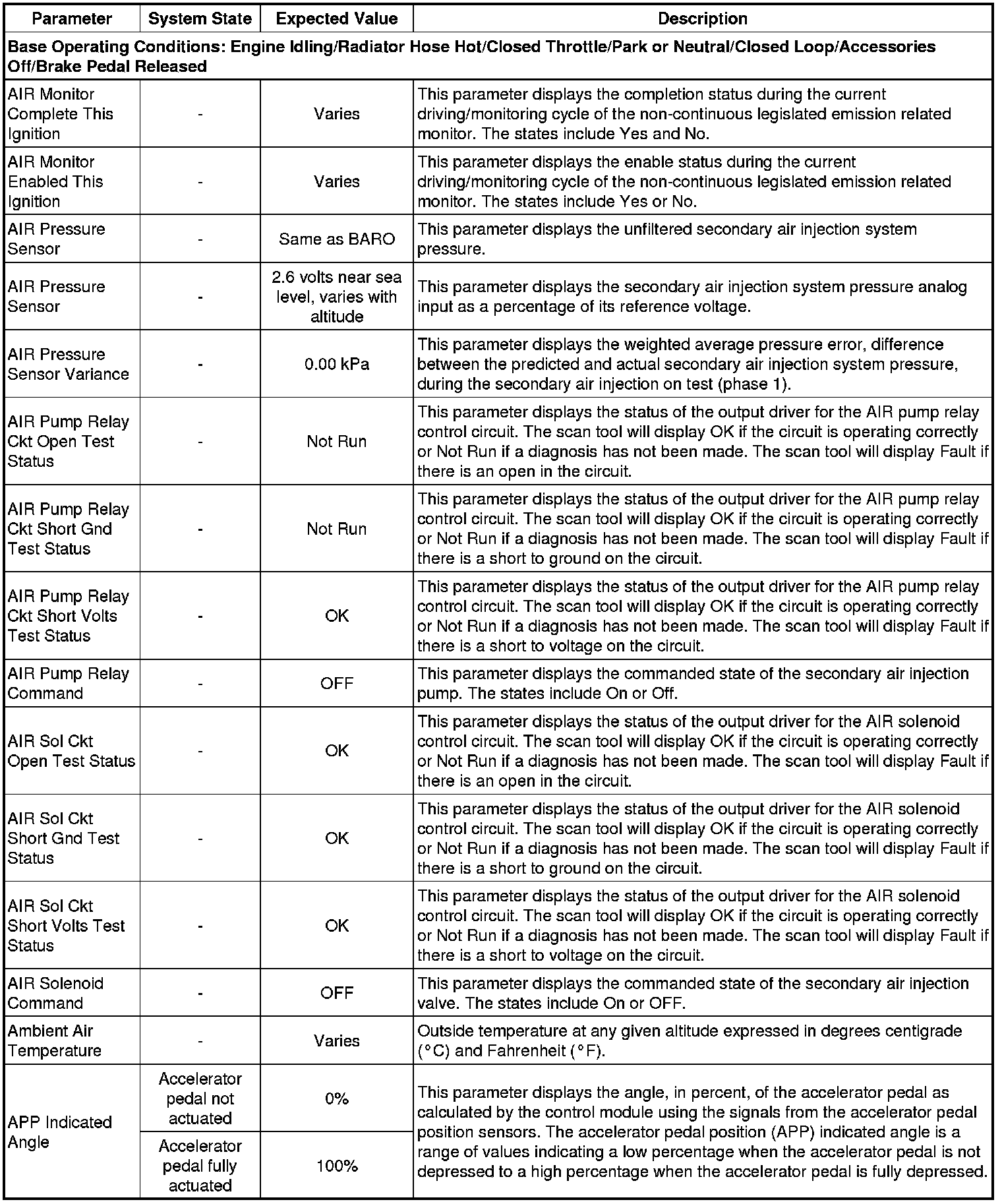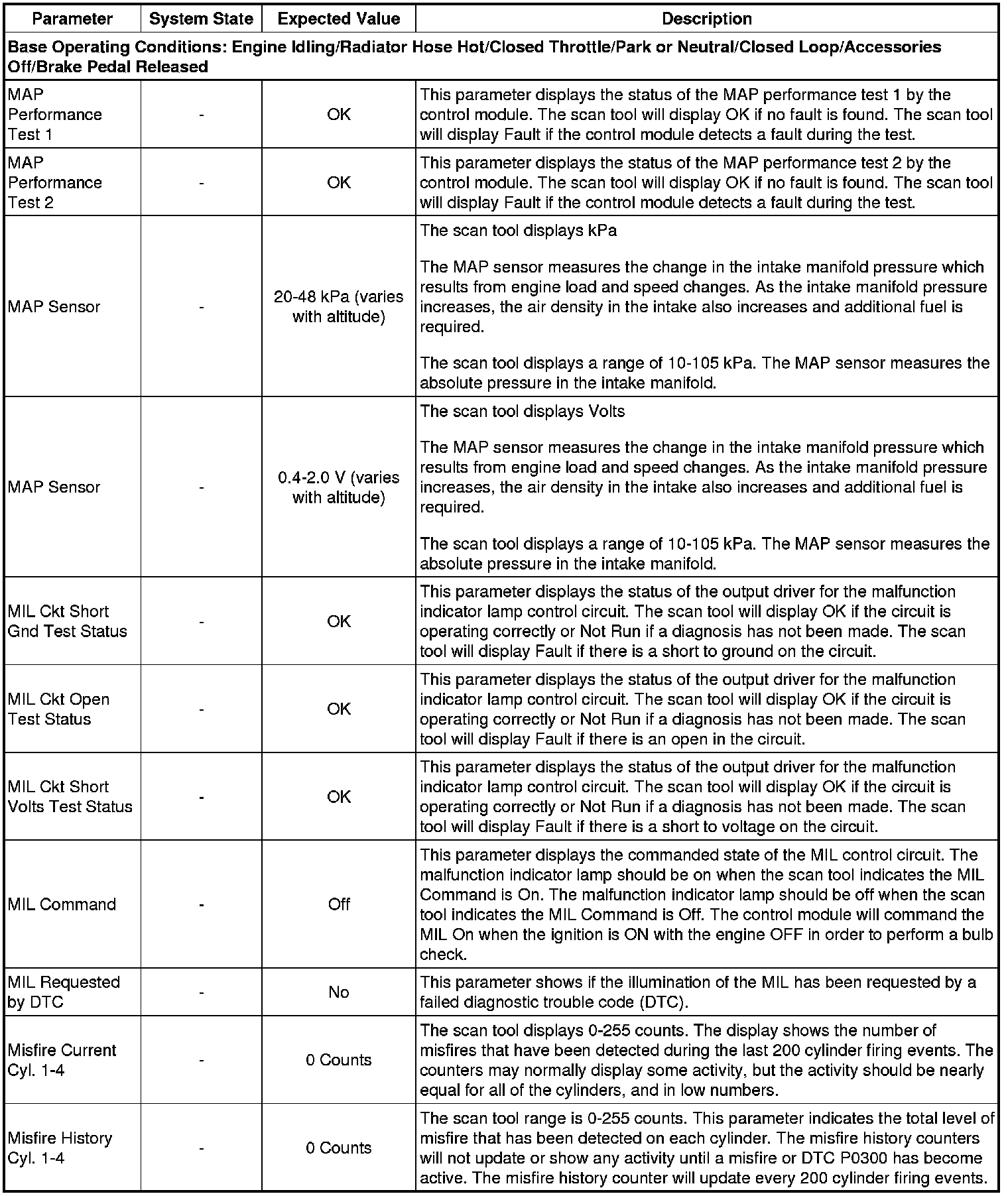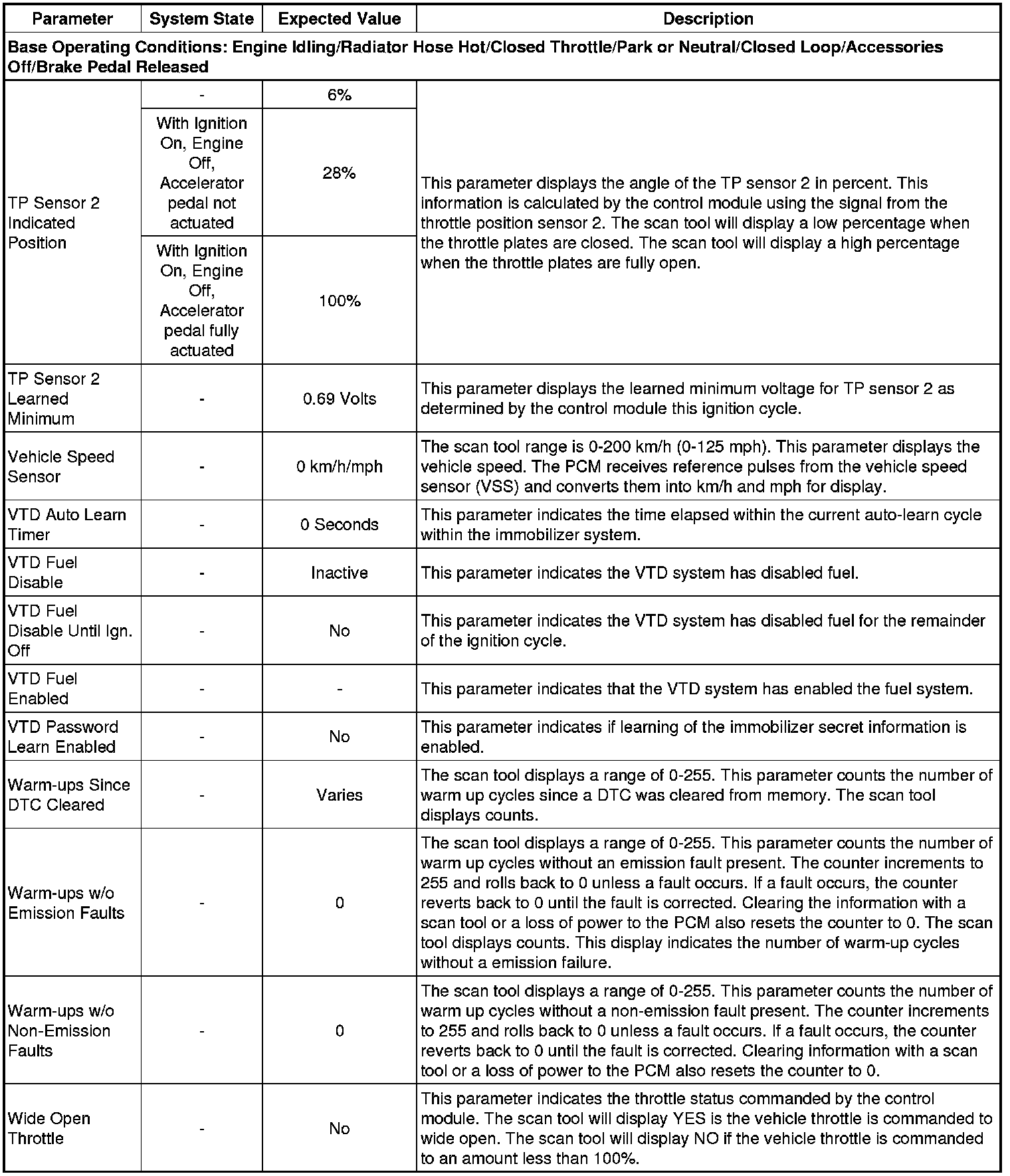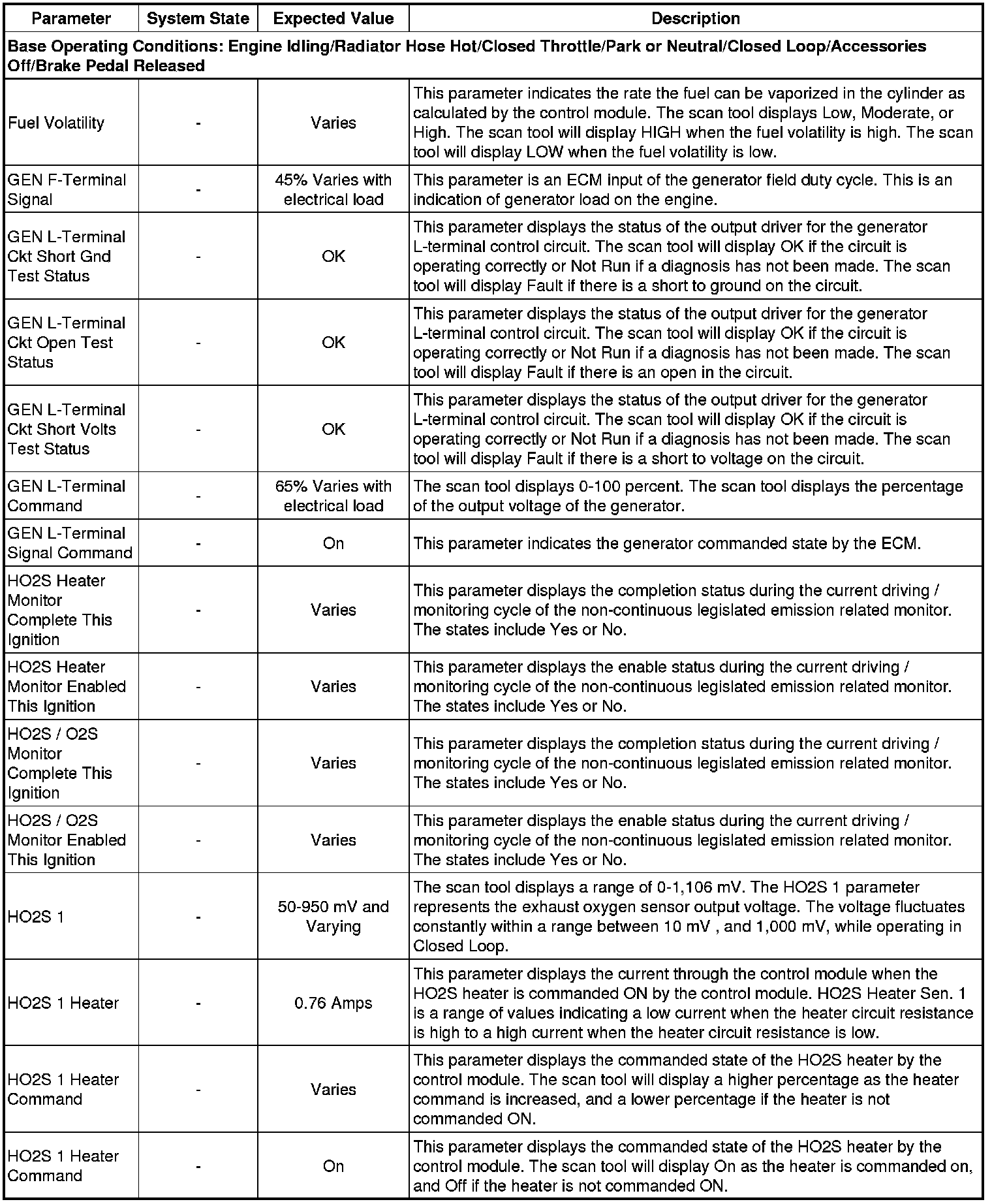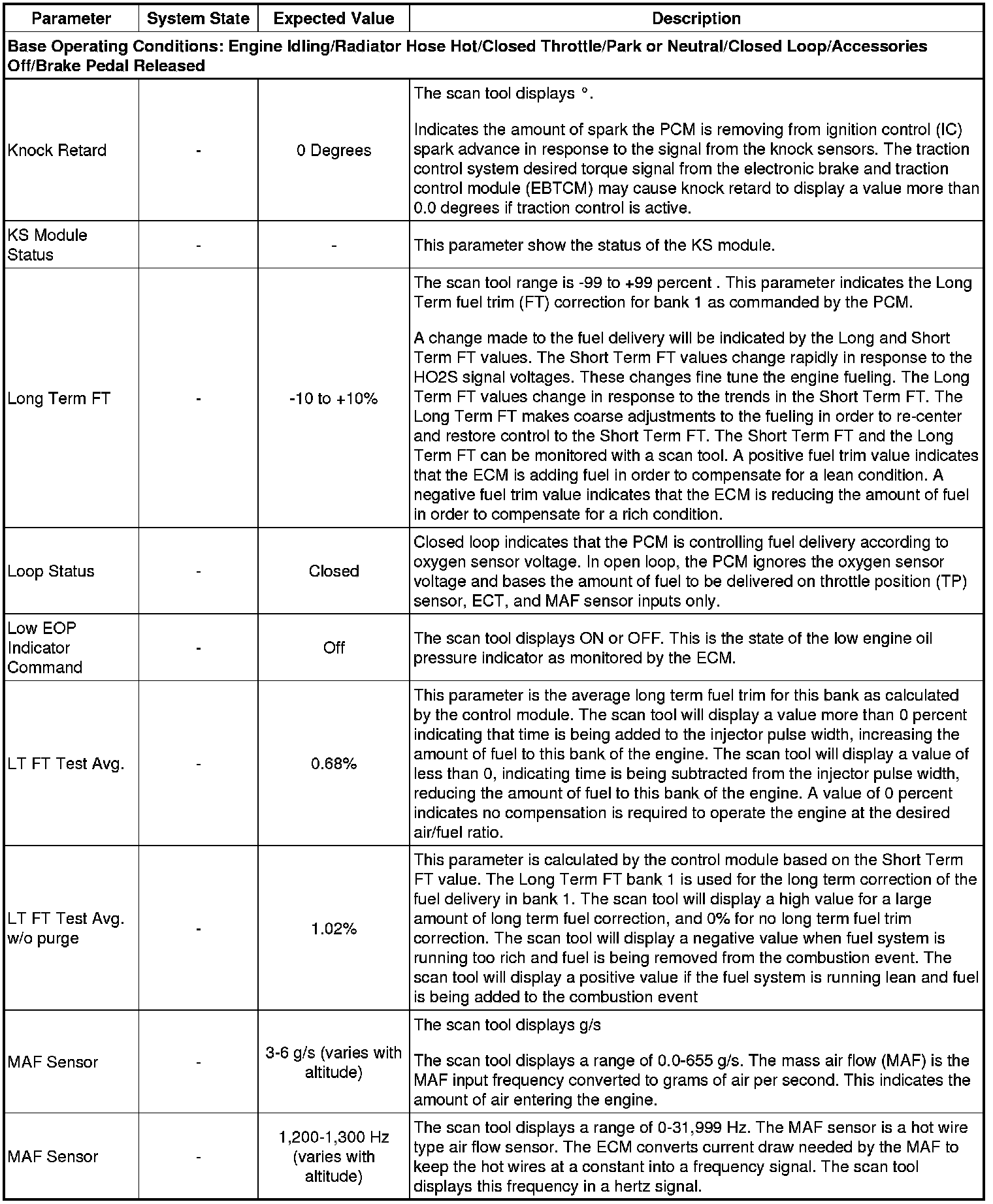 Only the parameters listed below are referenced in this service manual for use in diagnosis. If all values are within the typical range described below, refer to Symptoms - Engine Controls (- Symptoms - Engine Controls) for the 2.4L engine for diagnosis.