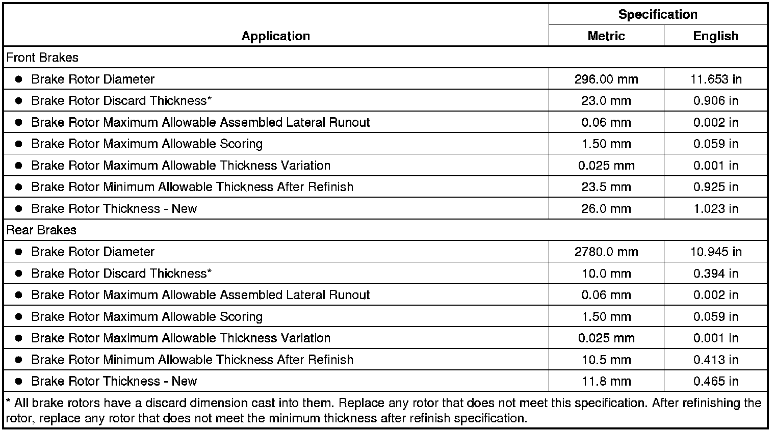 Disc Brake Component Specifications