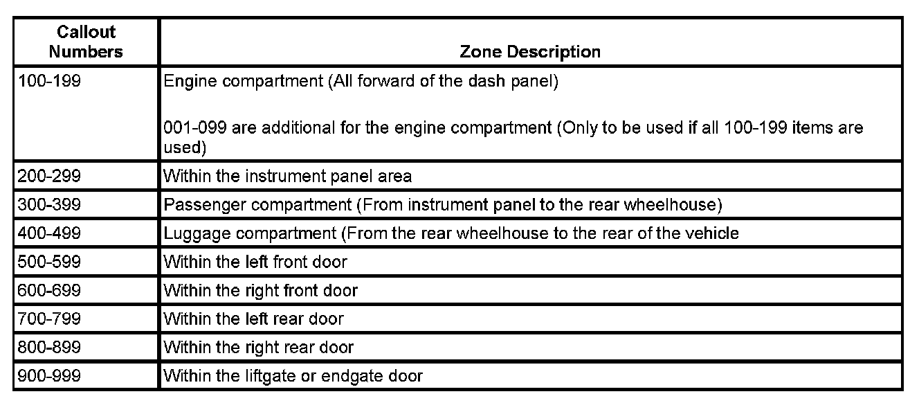 All grounds, in-line connectors, pass-through grommets, and splices have identifying numbers that correspond to where they are located in the vehicle. The following table explains the numbering system.