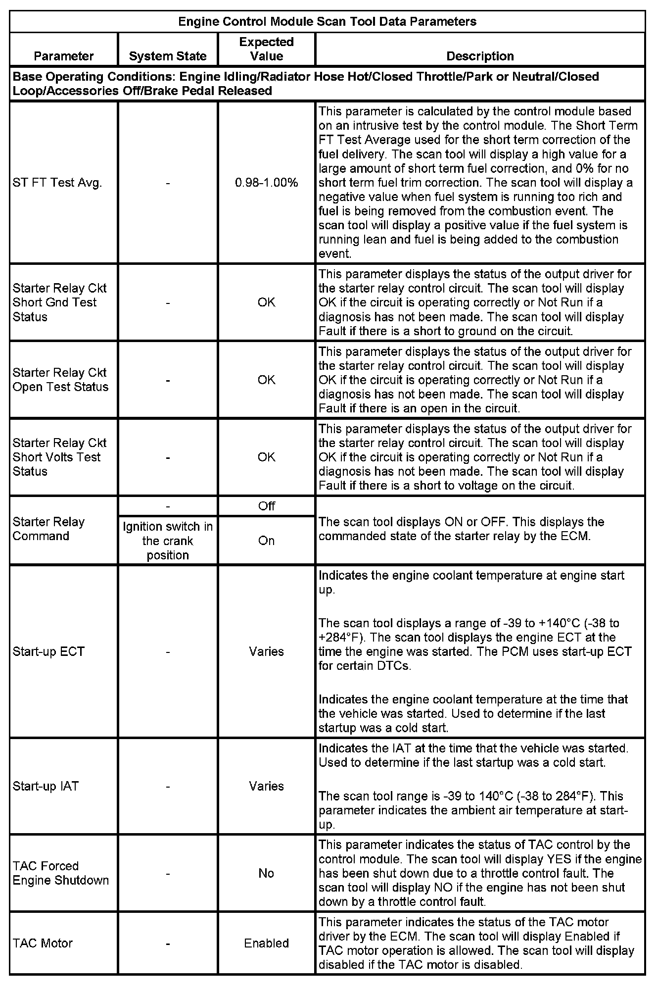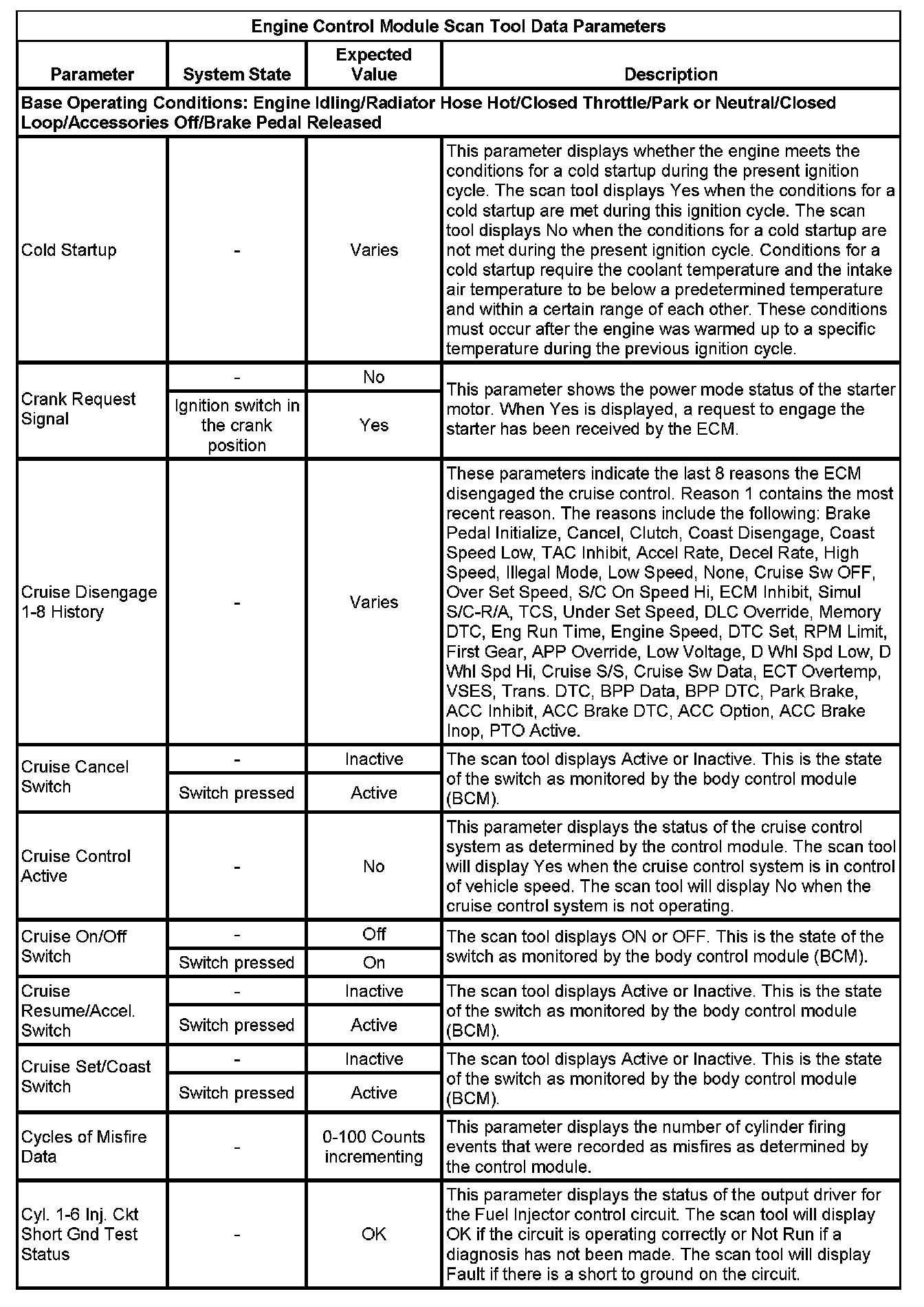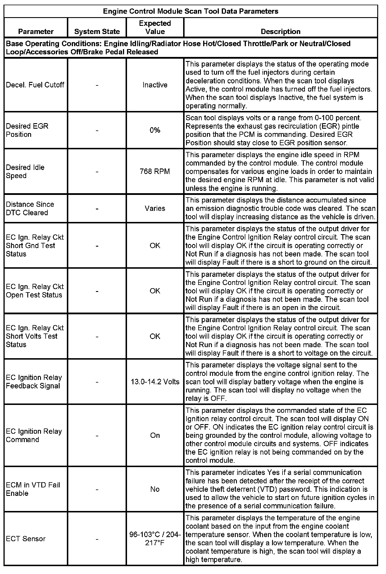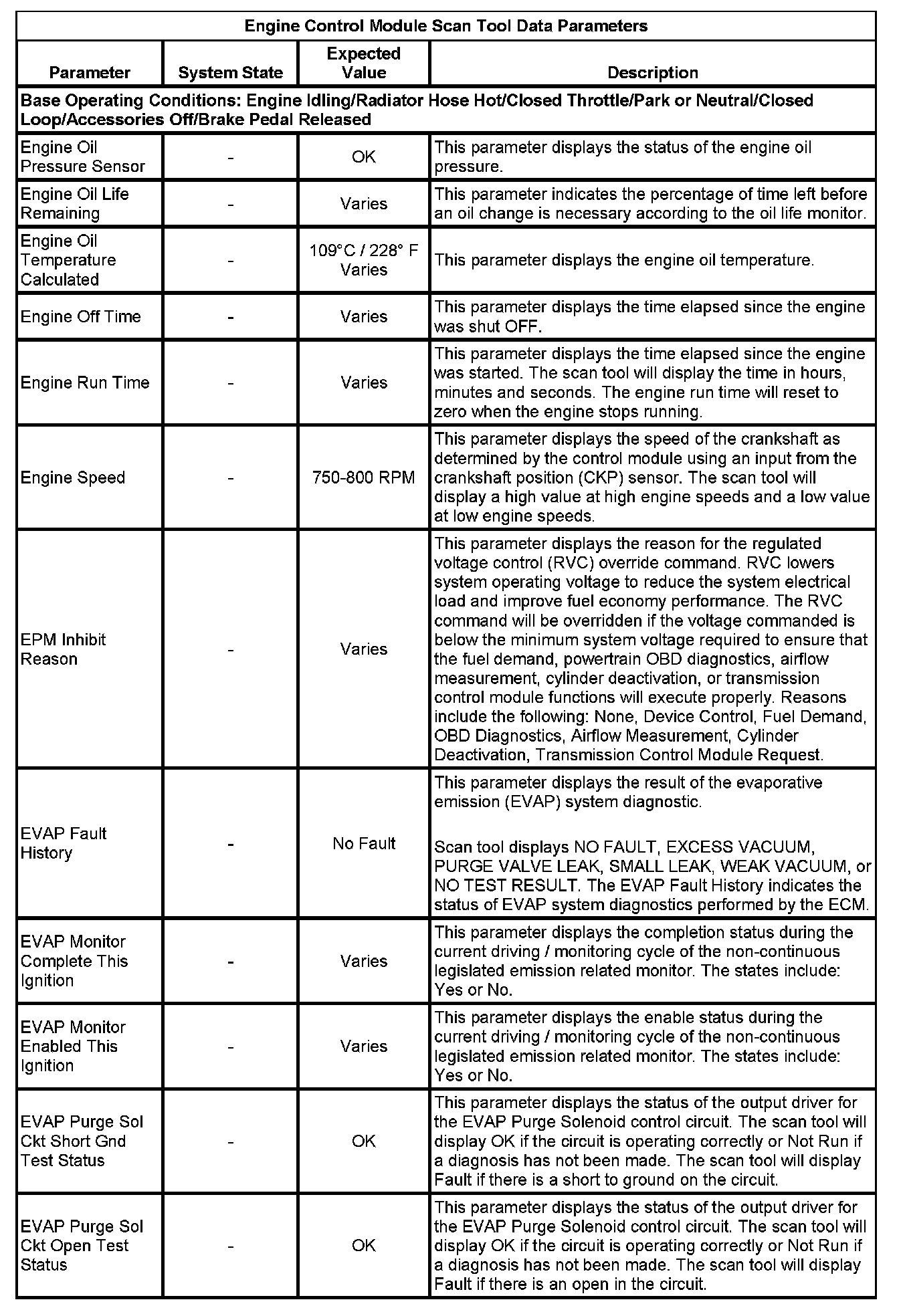 The Engine Control Module Scan Tool Data List contains all engine-related parameters that are available on the scan tool. The list is arranged in alphabetical order. A given parameter may appear in any one of the data lists, and in some cases may appear more than once, or in more than one data list in order to group certain related parameters together.