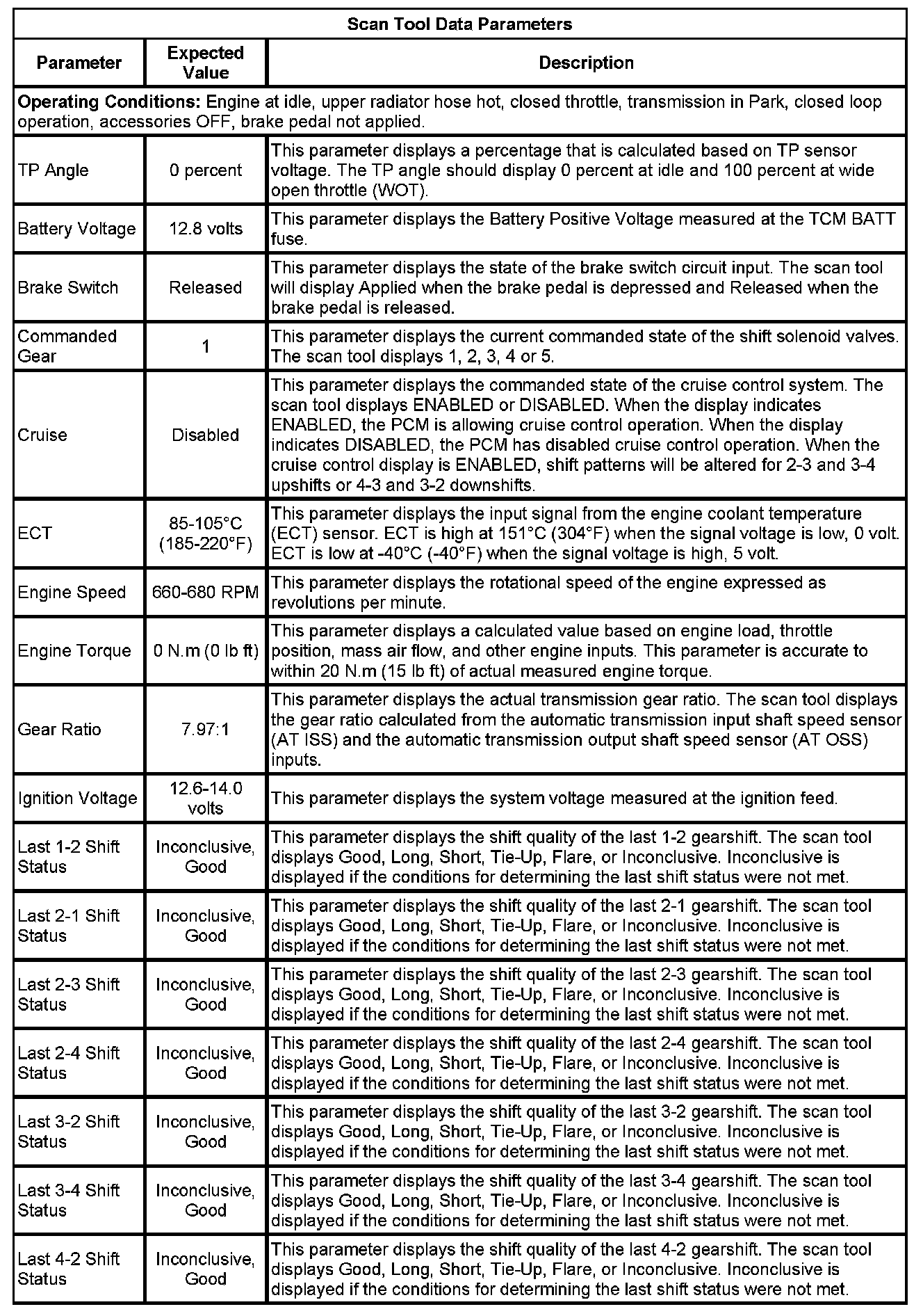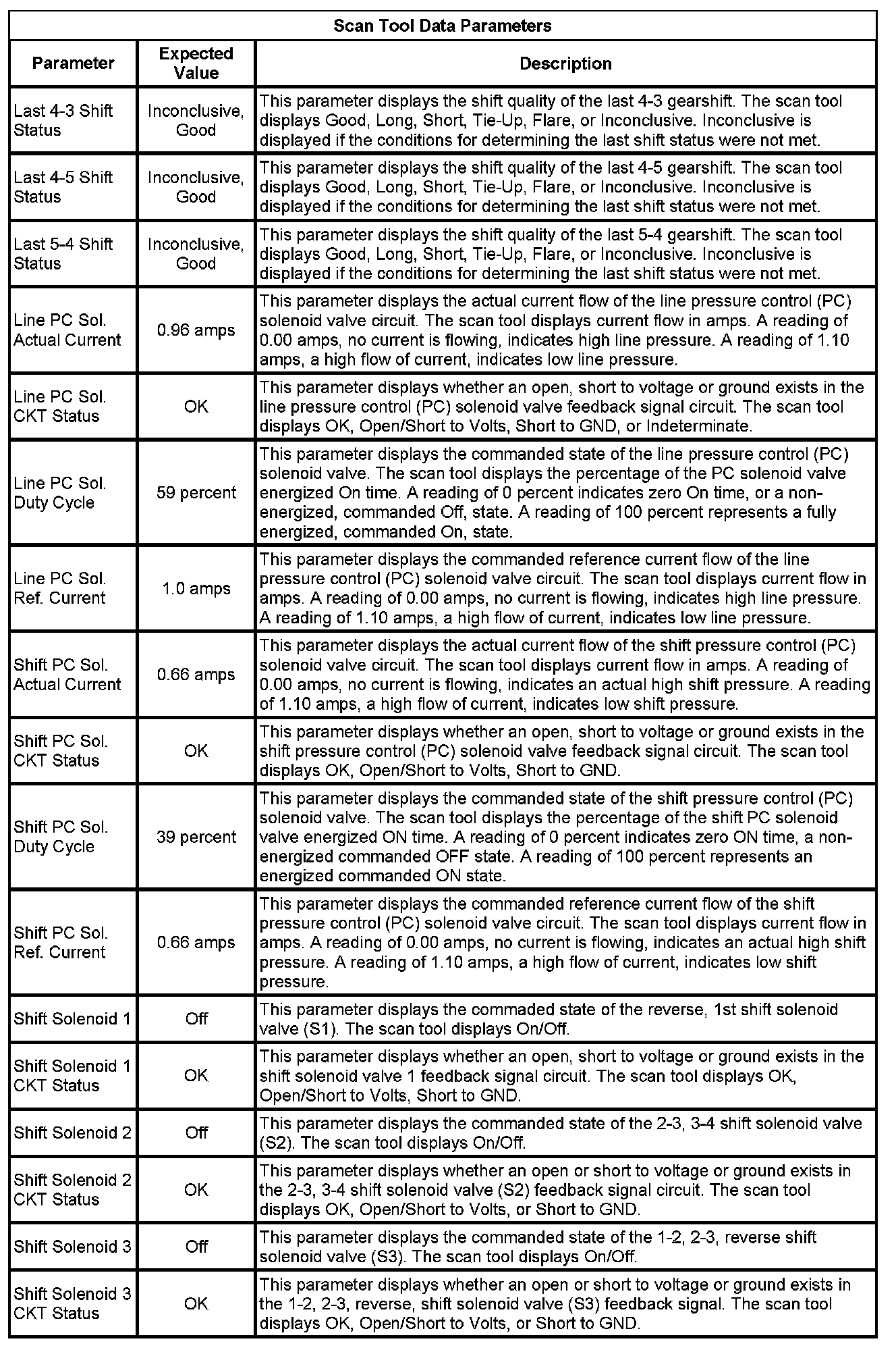 The Transmission Control Module Scan Tool Data List contains all transmission related parameters that are available on the scan tool. The list is arranged in alphabetical order. A given parameter may appear in any one of the data lists, and in some cases may appear more than once, or in more than one data list in order to group certain related parameters together.