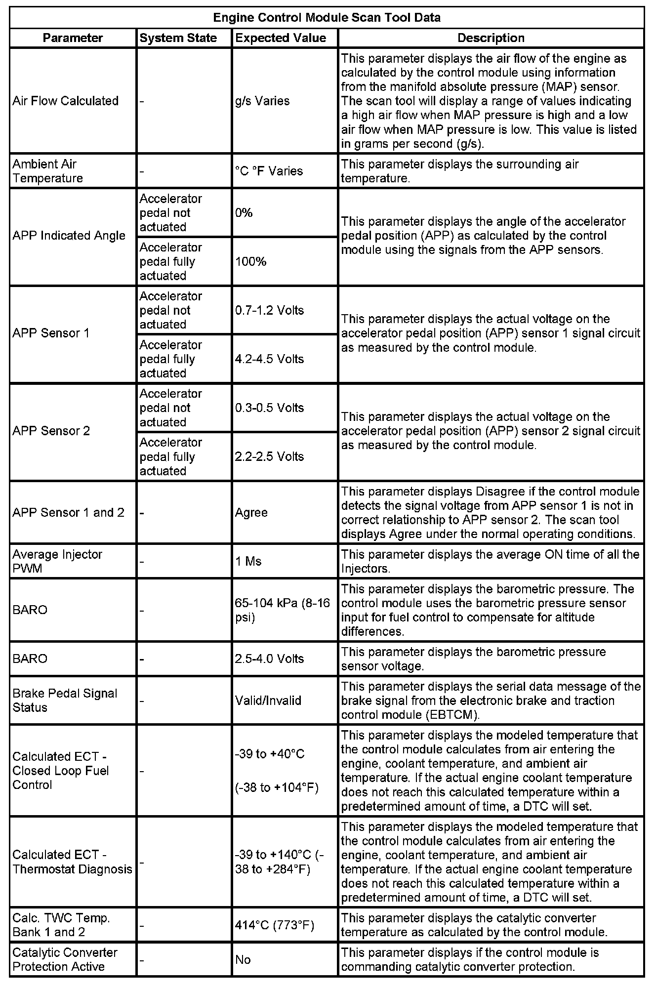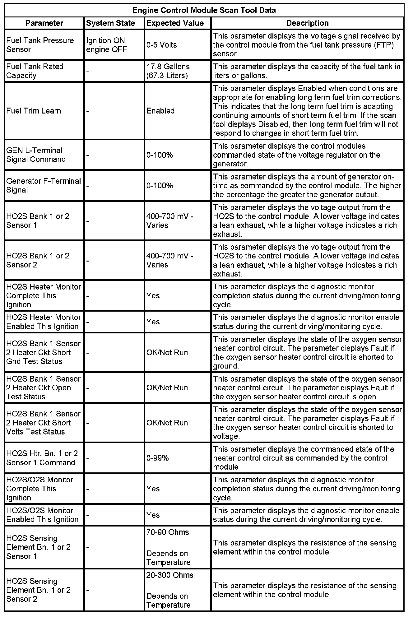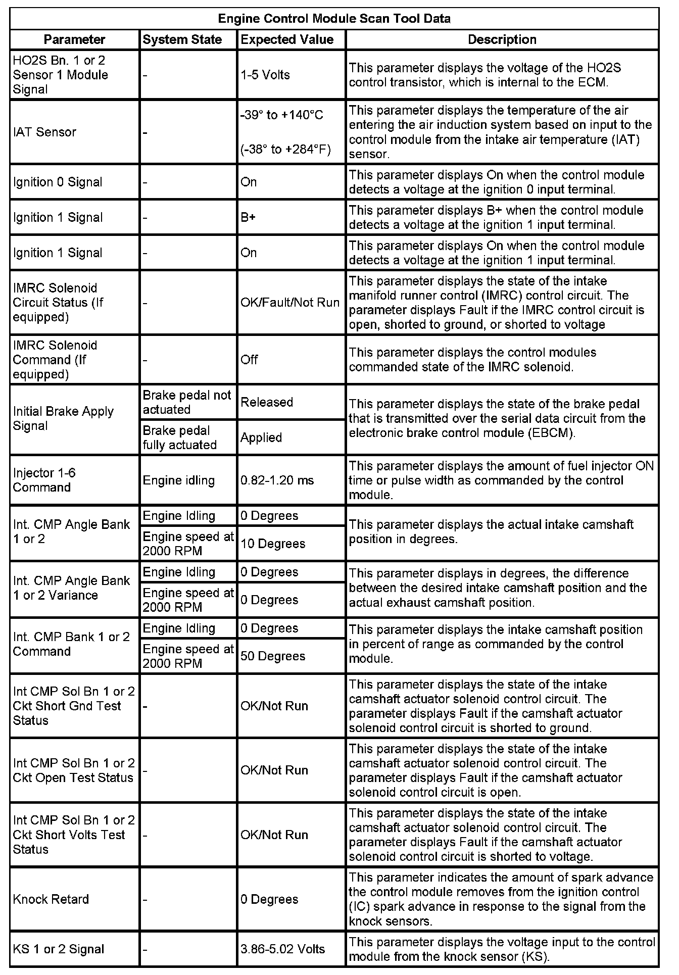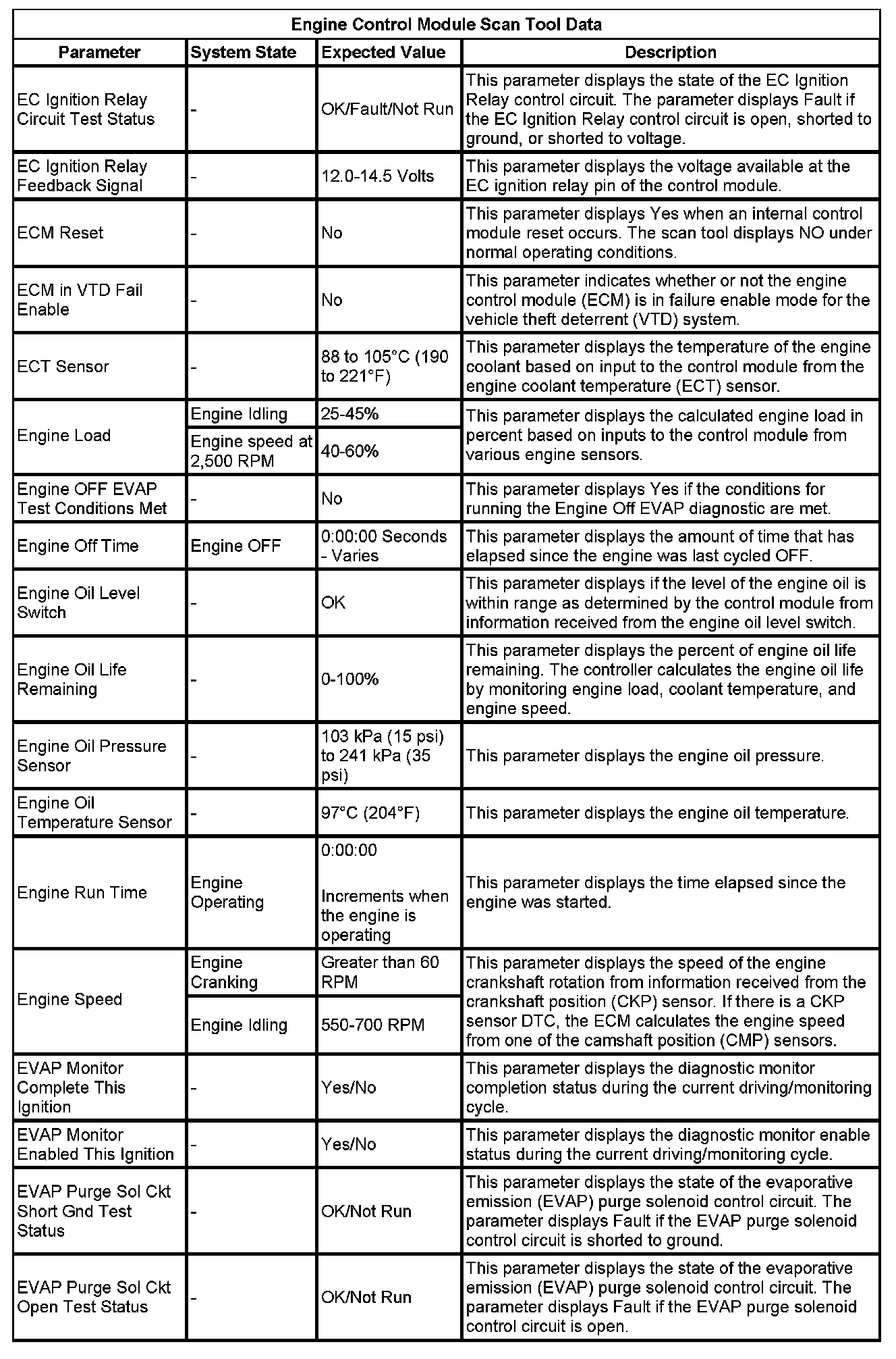 The Engine Control Module Scan Tool Data List contains all engine-related parameters that are available on the scan tool. The list is arranged in alphabetical order. A given parameter may appear in any one of the data lists, and in some cases may appear more than once, or in more than one data list in order to group certain related parameters together.