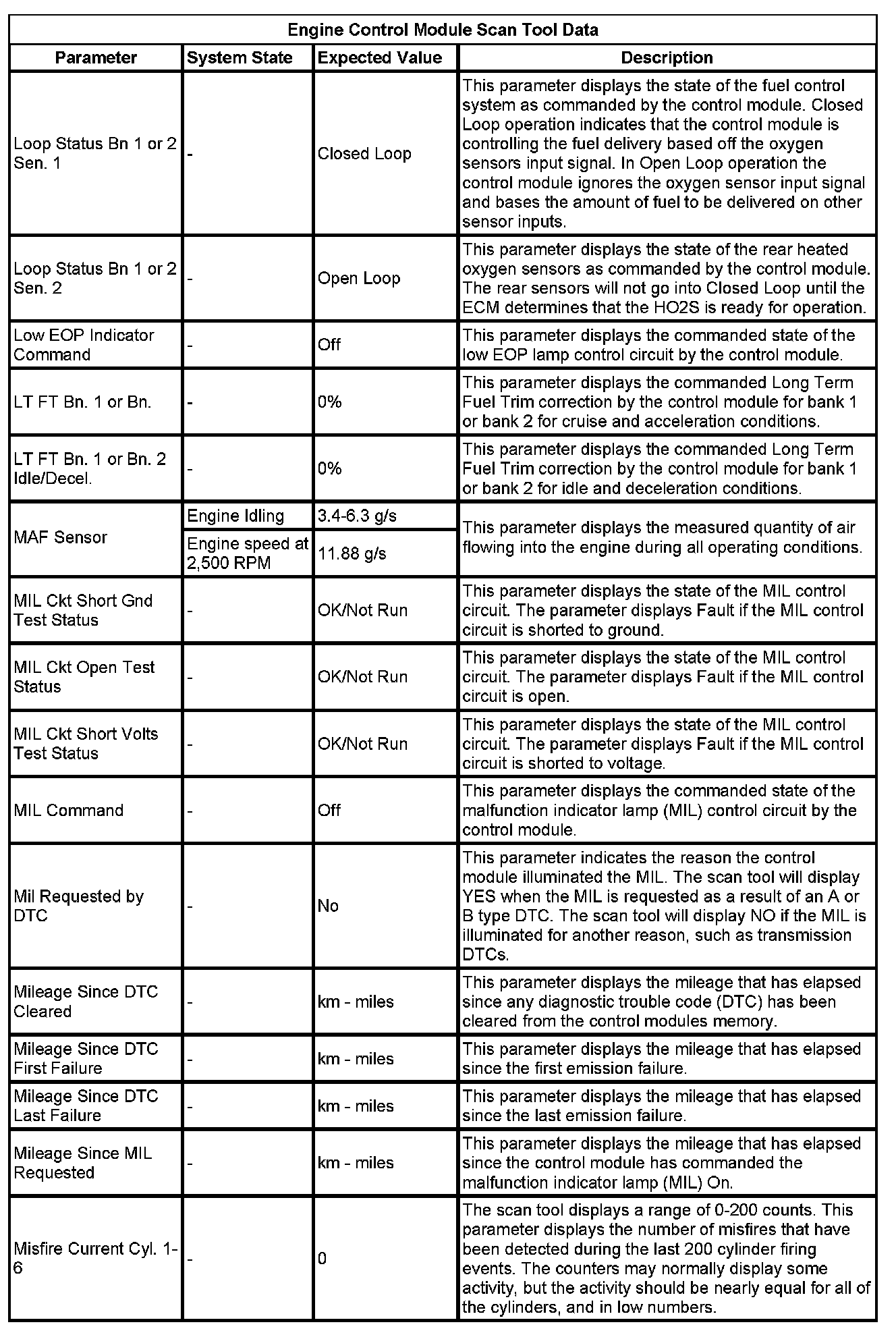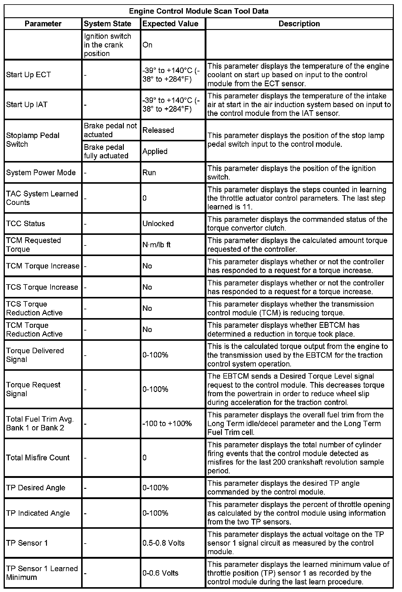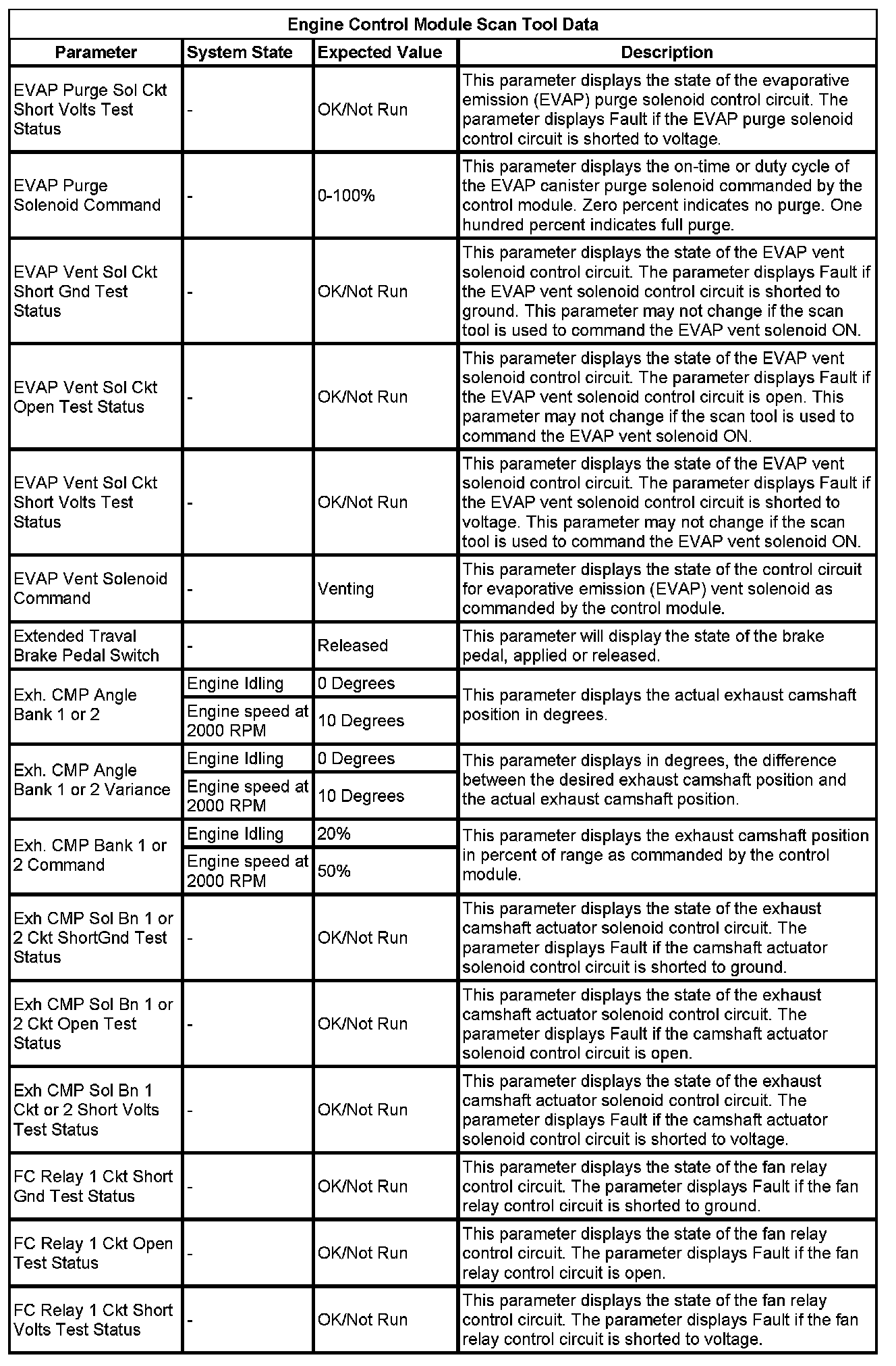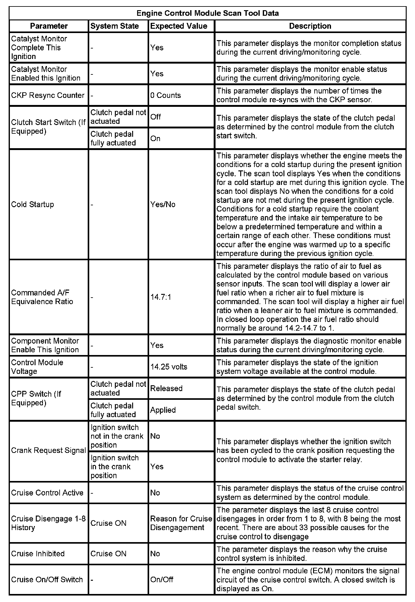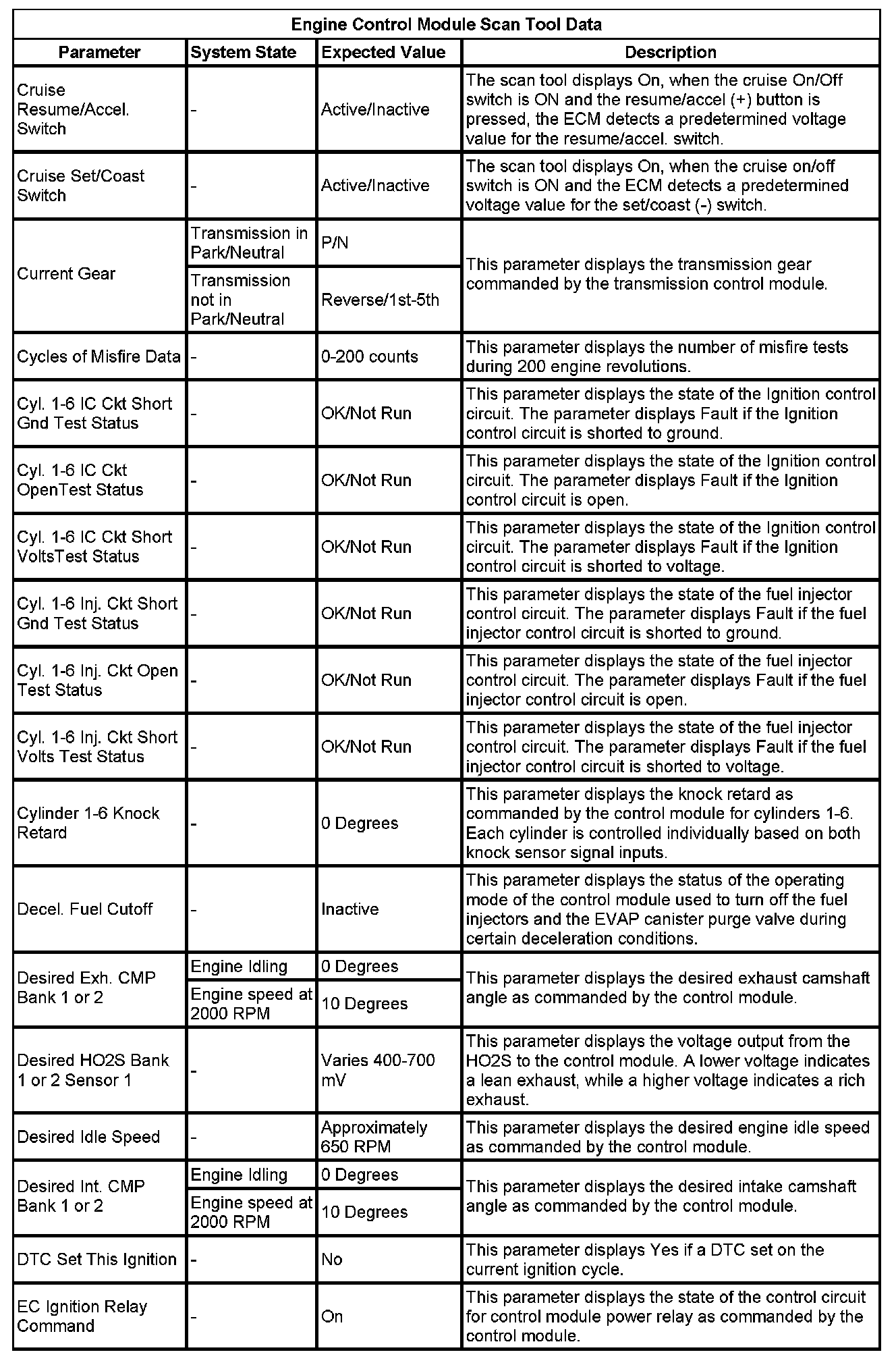The Engine Control Module Scan Tool Data List contains all engine-related parameters that are available on the scan tool. The list is arranged in alphabetical order. A given parameter may appear in any one of the data lists, and in some cases may appear more than once, or in more than one data list in order to group certain related parameters together.