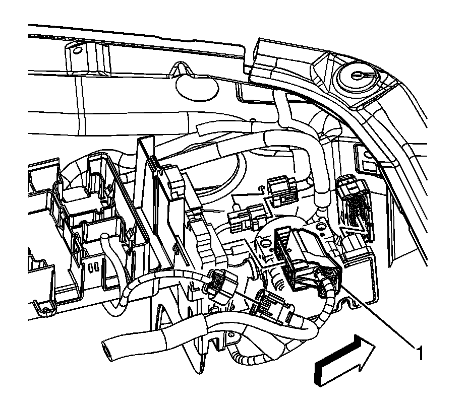 6. Release the retaining tab (1) in order to release the ECM from the underhood junction block bracket.