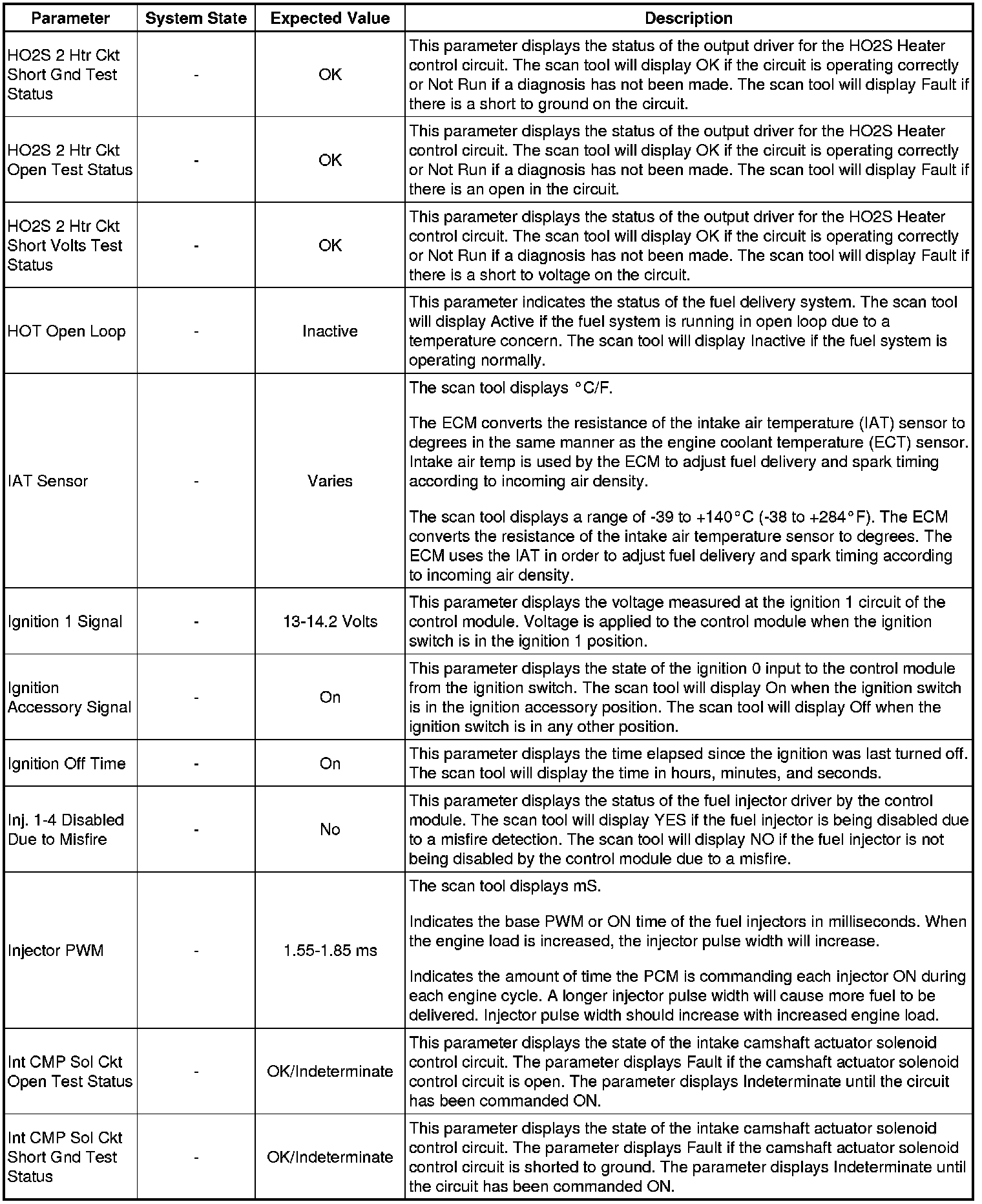 Only the parameters listed below are referenced in this service manual for use in diagnosis. If all values are within the typical range described below, refer to Symptoms - Engine Controls (- Symptoms - Engine Controls) for the 2.4L engine for diagnosis.