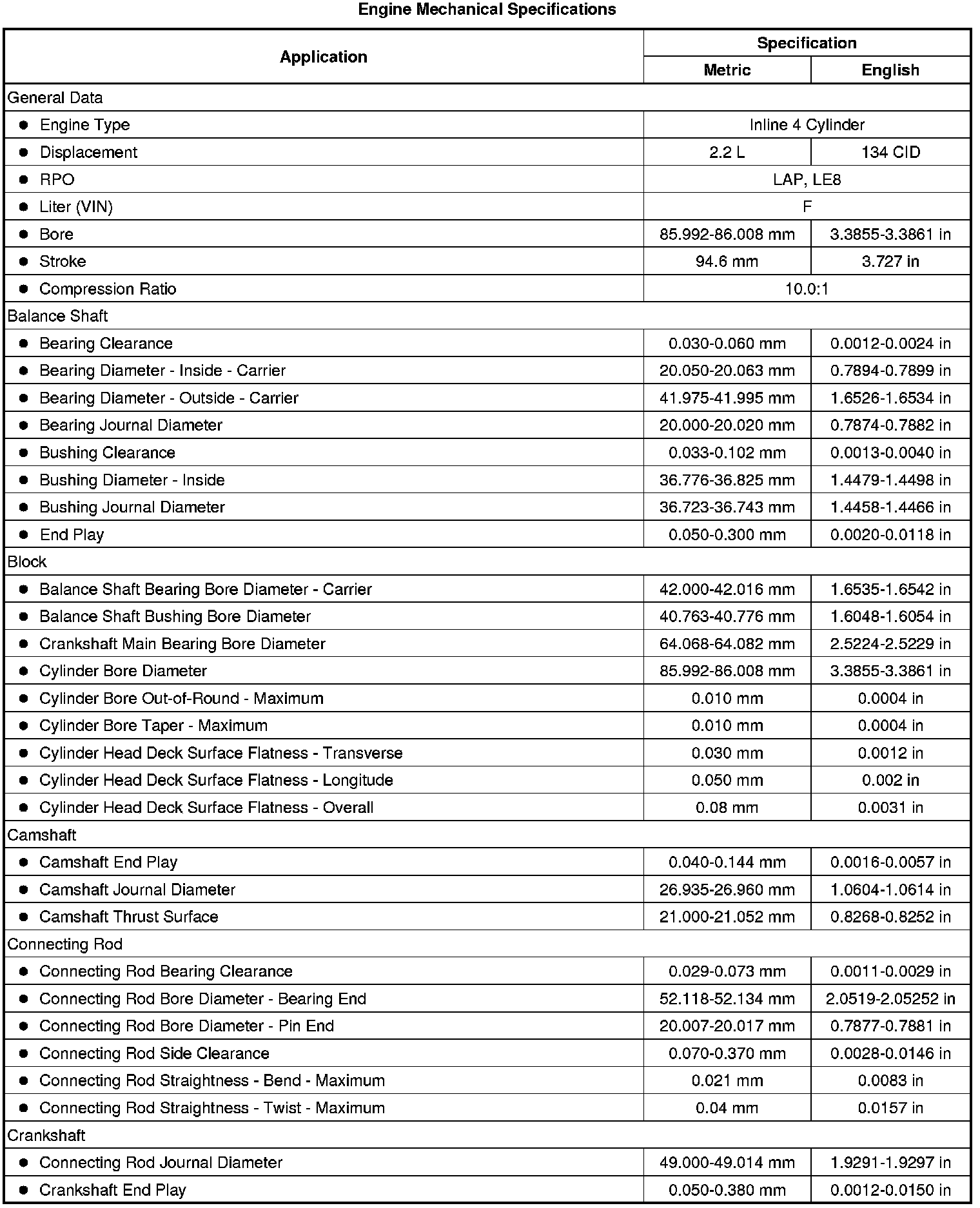 Engine Mechanical Specifications (2.2L)