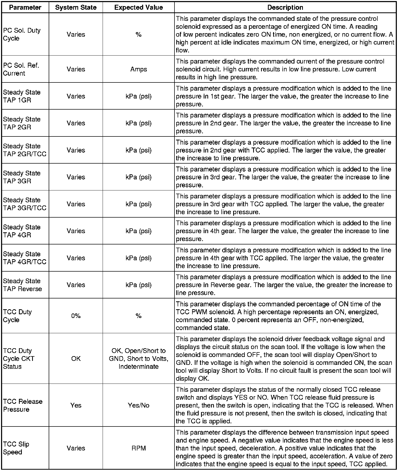 The Transmission Control Module Scan Tool Data List contains all transmission related parameters that are available on the scan tool. The list is arranged in alphabetical order. A given parameter may appear in any one of the data lists, and in some cases may appear more than once, or in more than one data list in order to group certain related parameters together.