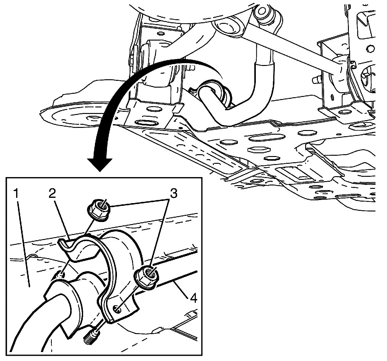 22. Remove the stabilizer bar insulator bracket to subframe retaining nuts (3) on both sides of the stabilizer bar (4). Repeat for the opposite side.