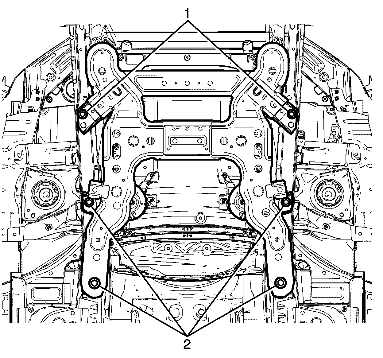 9. Install the front sub frame to front chassis rail retaining bolts (1 and 2) and tighten to 95 Nm (70 lb ft).