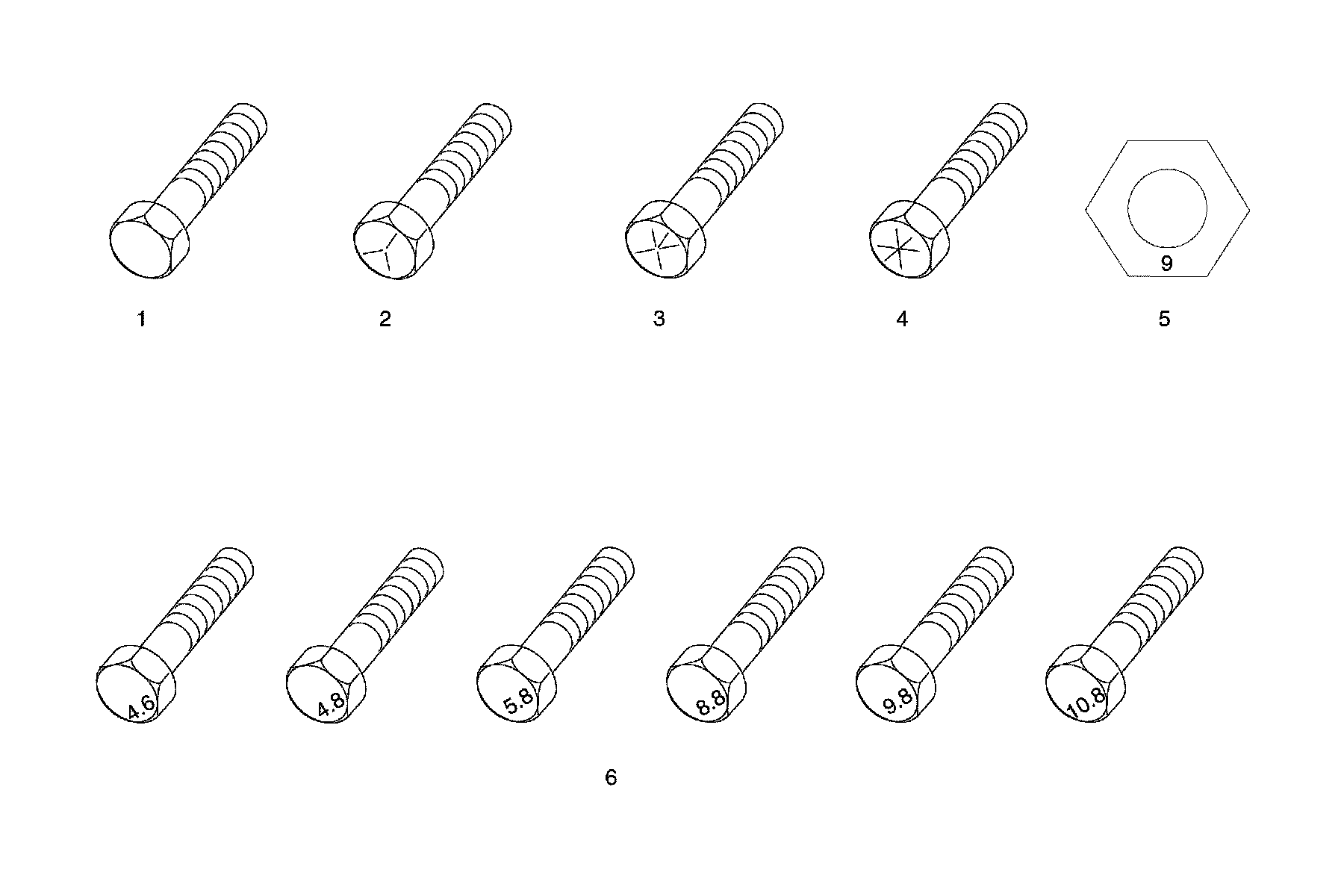 The most commonly used metric fastener strength property classes are 9.8 and 10.9. The class identification is embossed on the head of each bolt. The English, inch strength classes range from grade 2 to grade 8. Radial lines are embossed on the head of each bolt in order to identify the strength class. The number of lines on the head of the bolt is 2 lines less than the actual grade. For example, a grade 8 bolt will have 6 radial lines on the bolt head. Some metric nuts are marked with a single digit strength identification number on the nut face.