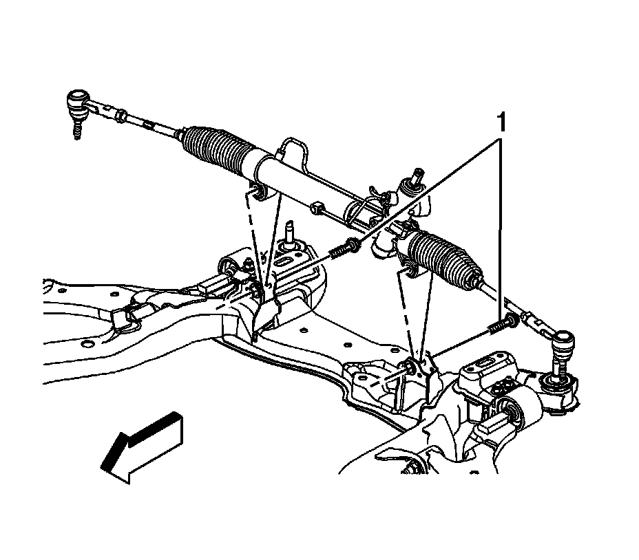 10. Install the power steering gear mounting bolts (1). Refer to Steering Gear Replacement (Electronic Power Steering) (Service and Repair)Steering Gear Replacement (Hydraulic Power Steering) (Service and Repair).