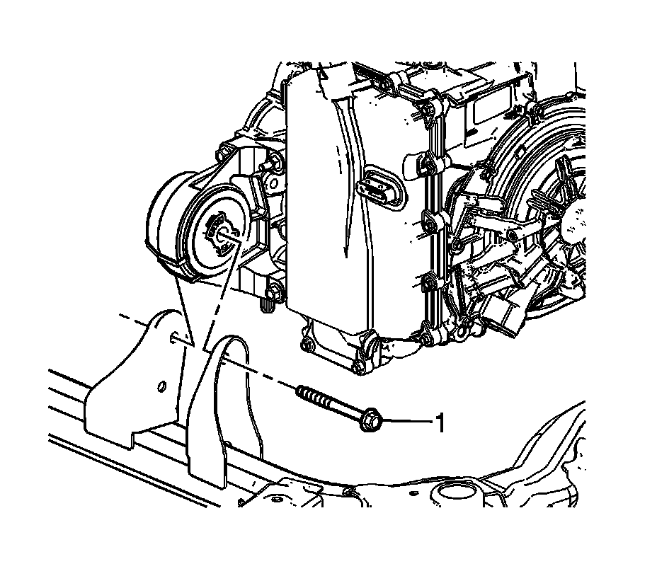 9. Install the front transmission mount thru bolt (1) and tighten to 110 Nm (81 lb ft).