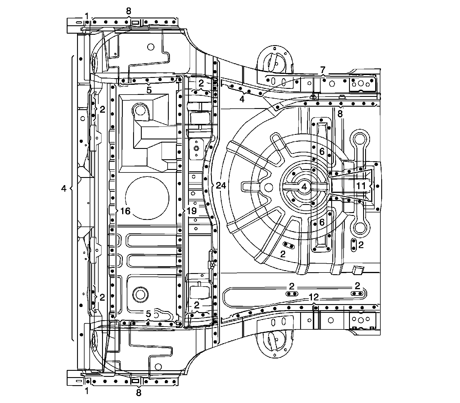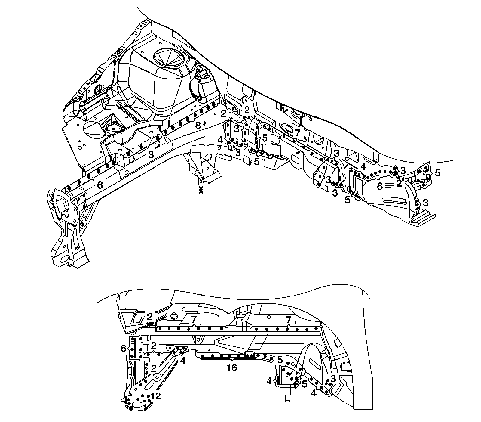 Important: The number of spot welds needed in each location is shown in illustration.