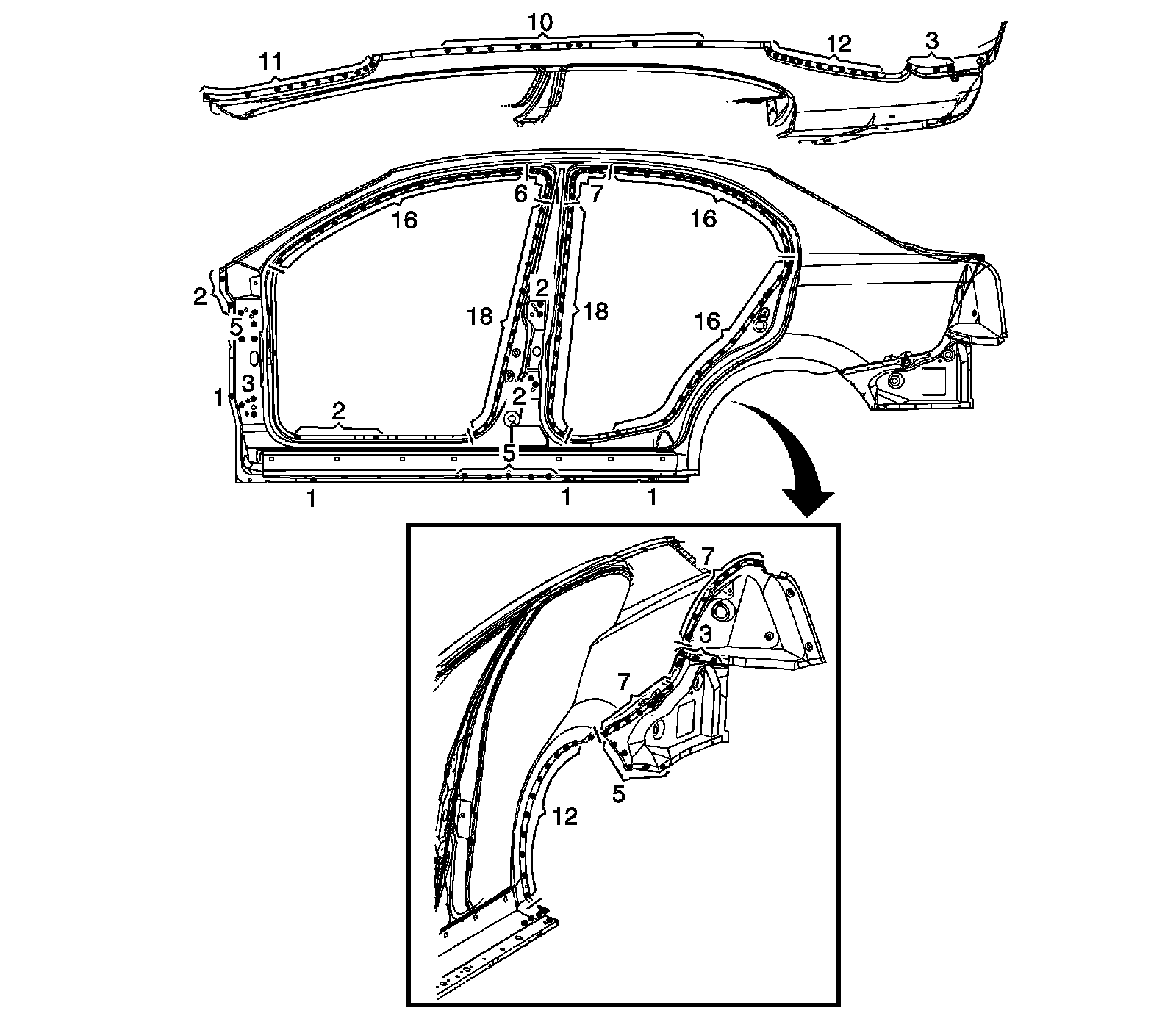 The side panel outer consists of side outer area and frame door area. The side outer area is a conspicuous part of the outer appearance of the vehicle. It is especially important for the body line continuing from door. Therefore, pay particular attention to it when conducting work. This part must be aligned with the rear door, trunk lid, rear glass and other parts.